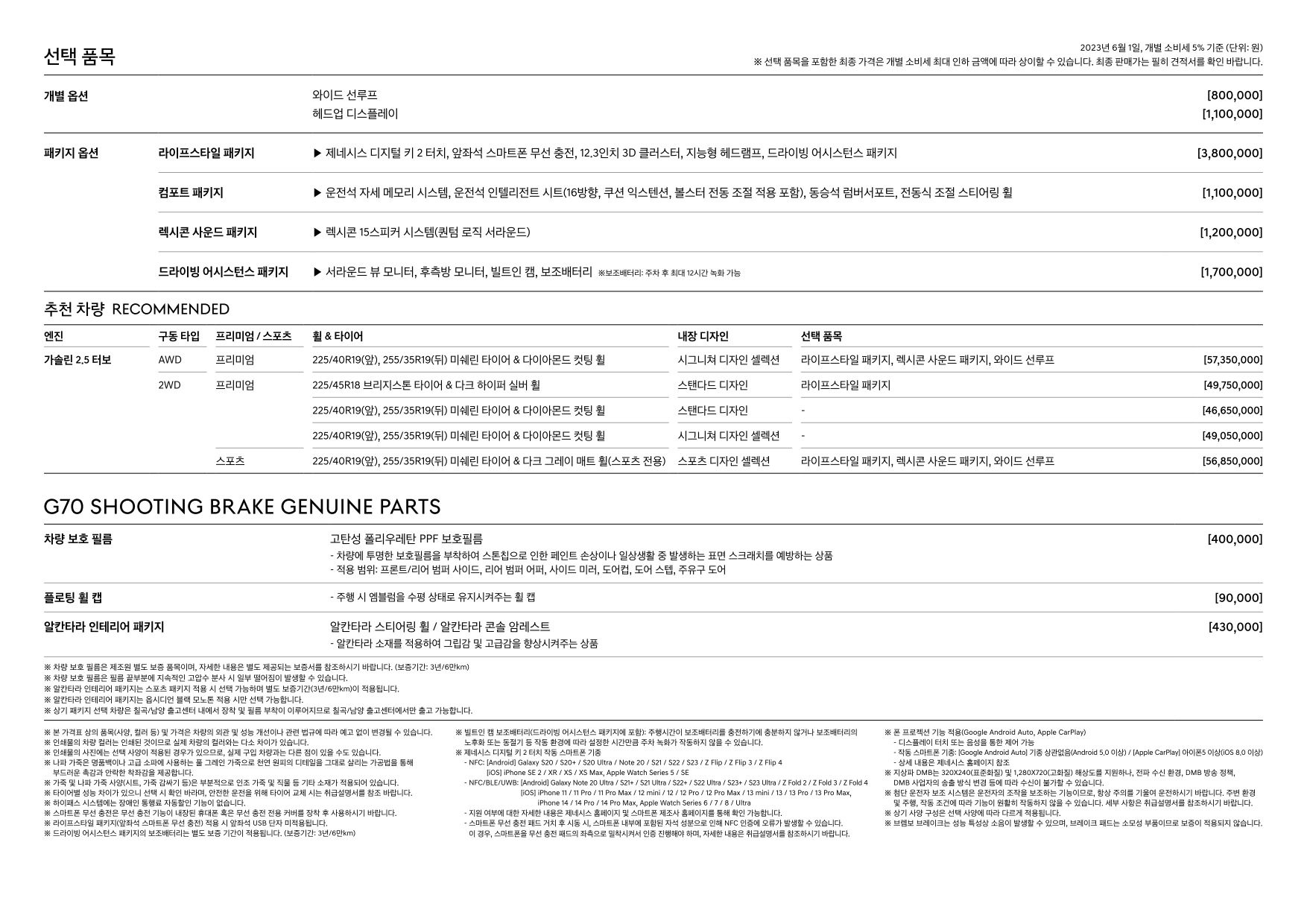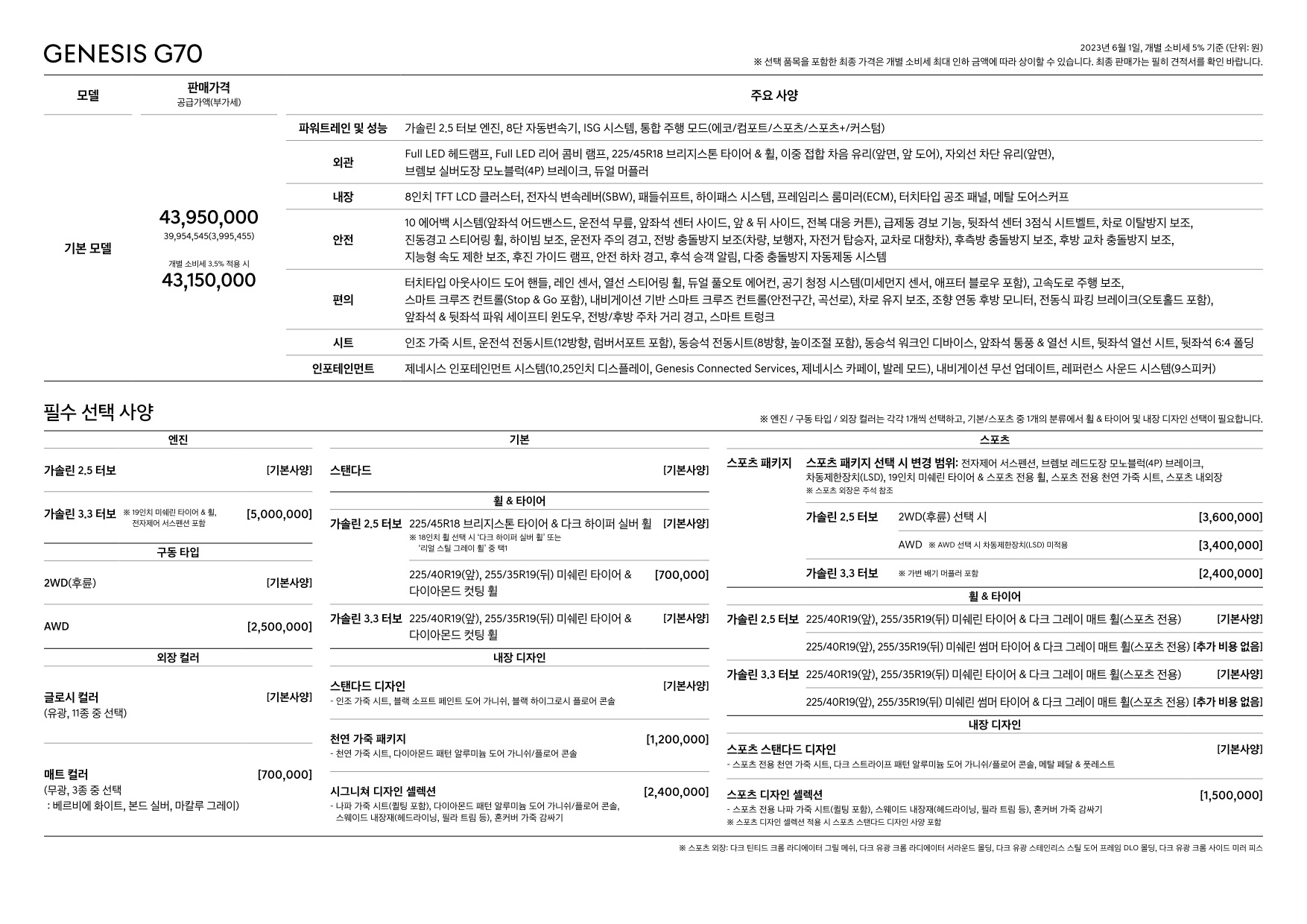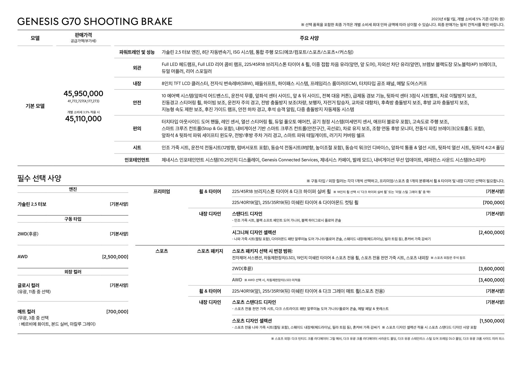 2023년 6월 제네시스 G70 & G70 슈팅브레이크 신차가격표 (2.5 터보 모델 추가)