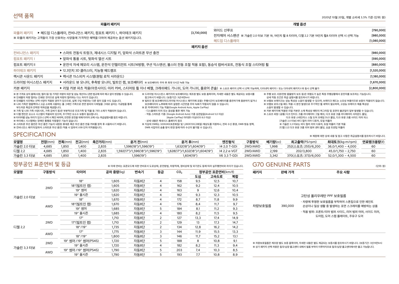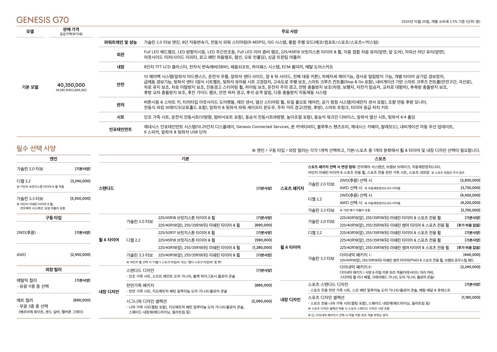 2020년 10월 G70 가격표 (제네시스 더 뉴 G70 출시)