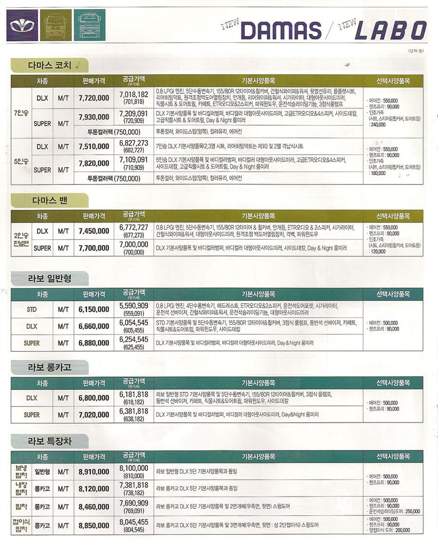 2008년 11월 뉴 다마스 & 뉴 라보 신차가격표