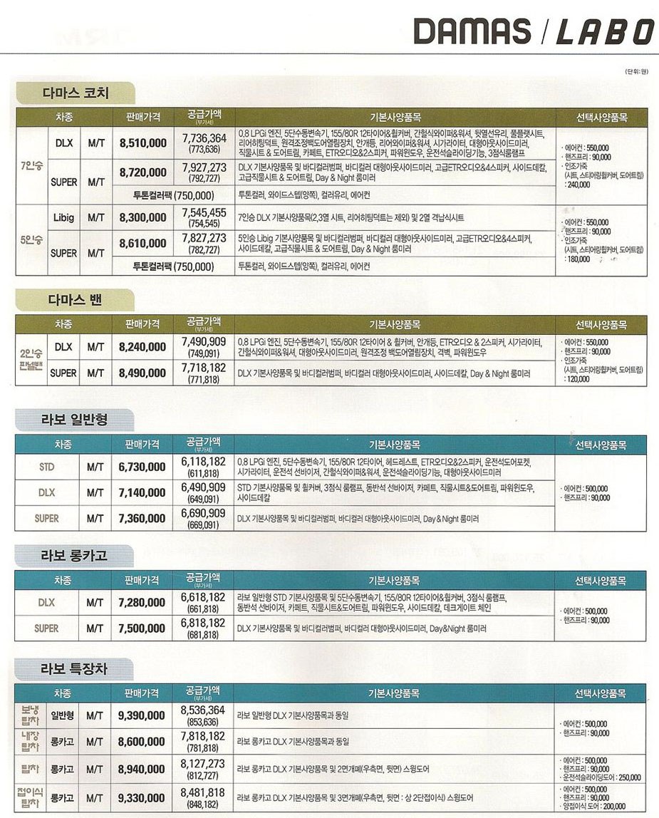 2010년 7월 다마스 & 라보 신차가격표