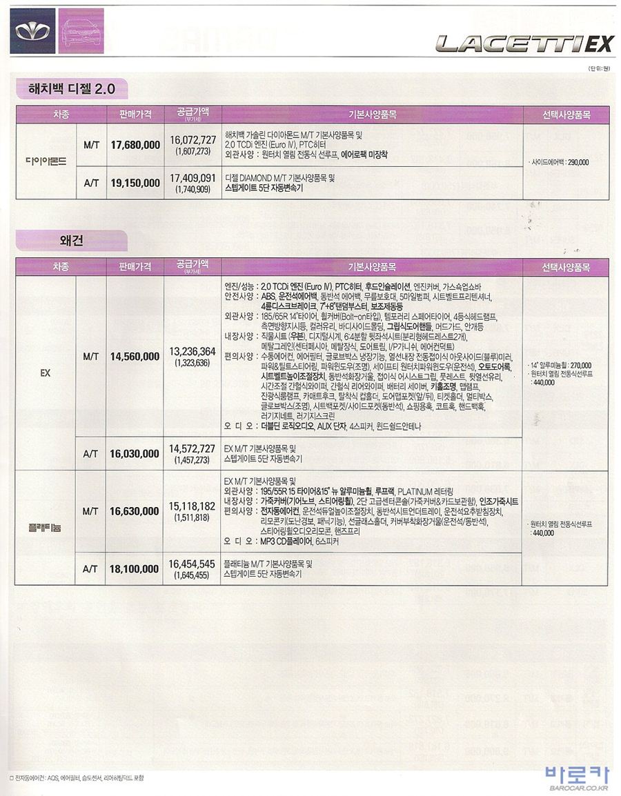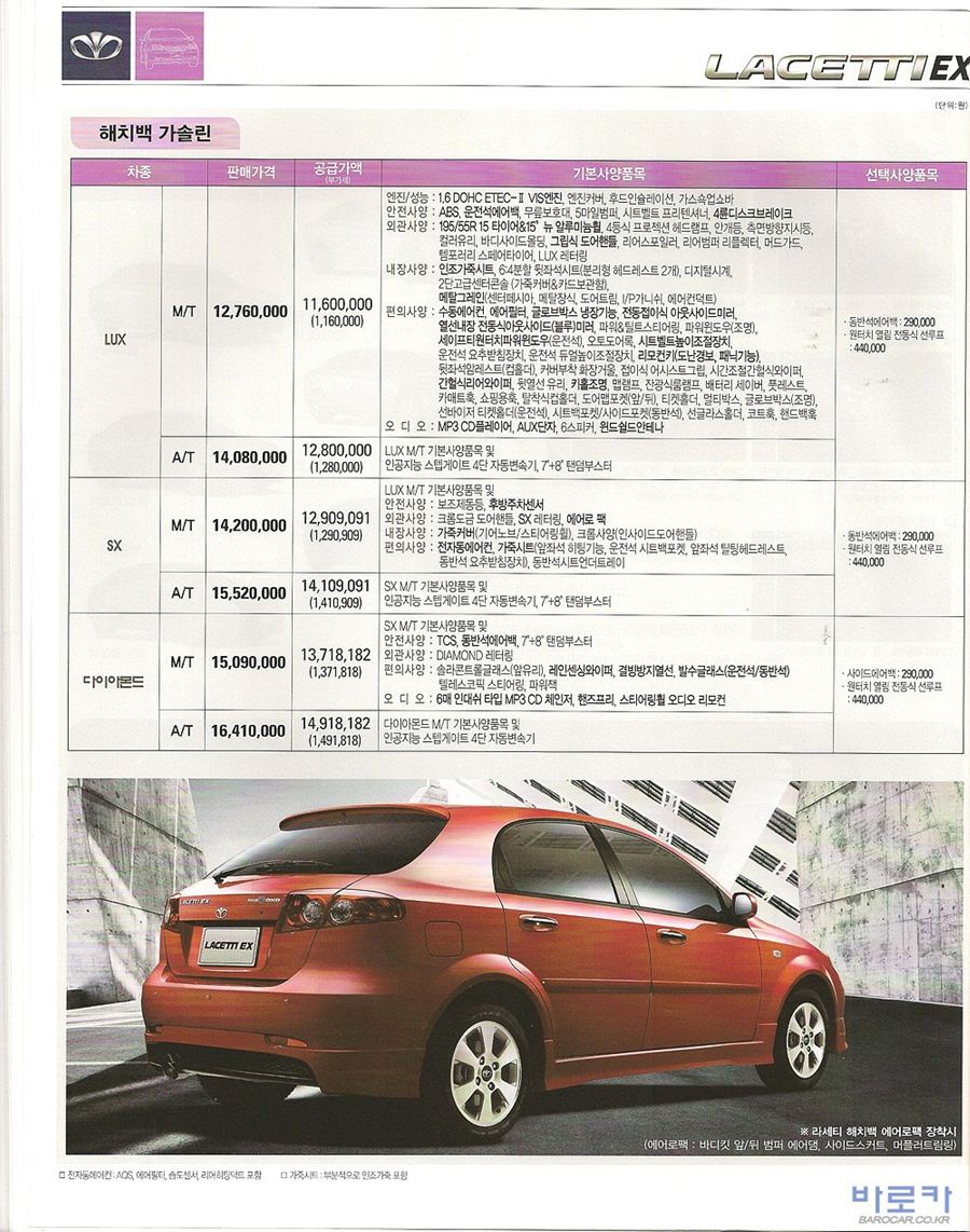 2008년 11월 라세티EX (뉴라세티 해치백) 신차가격표