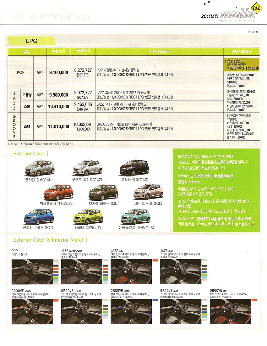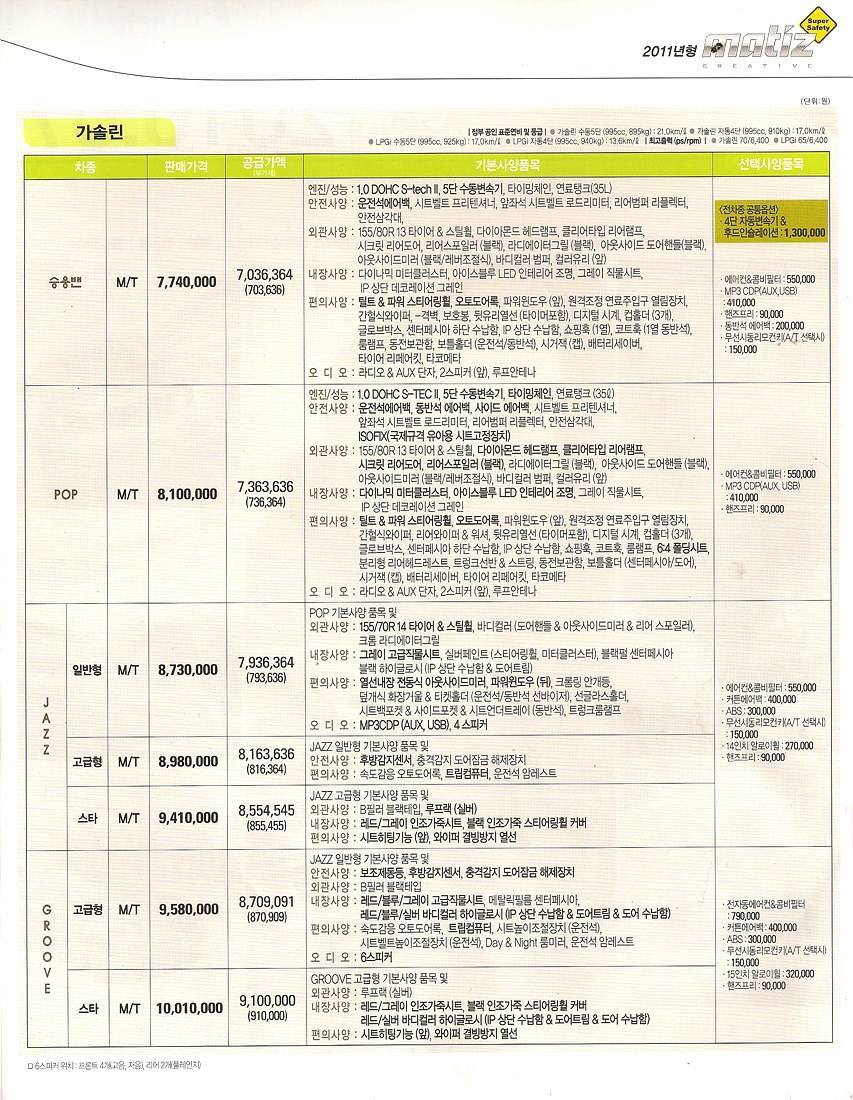 2010년 12월 마티즈 크리에이티브 신차가격표
