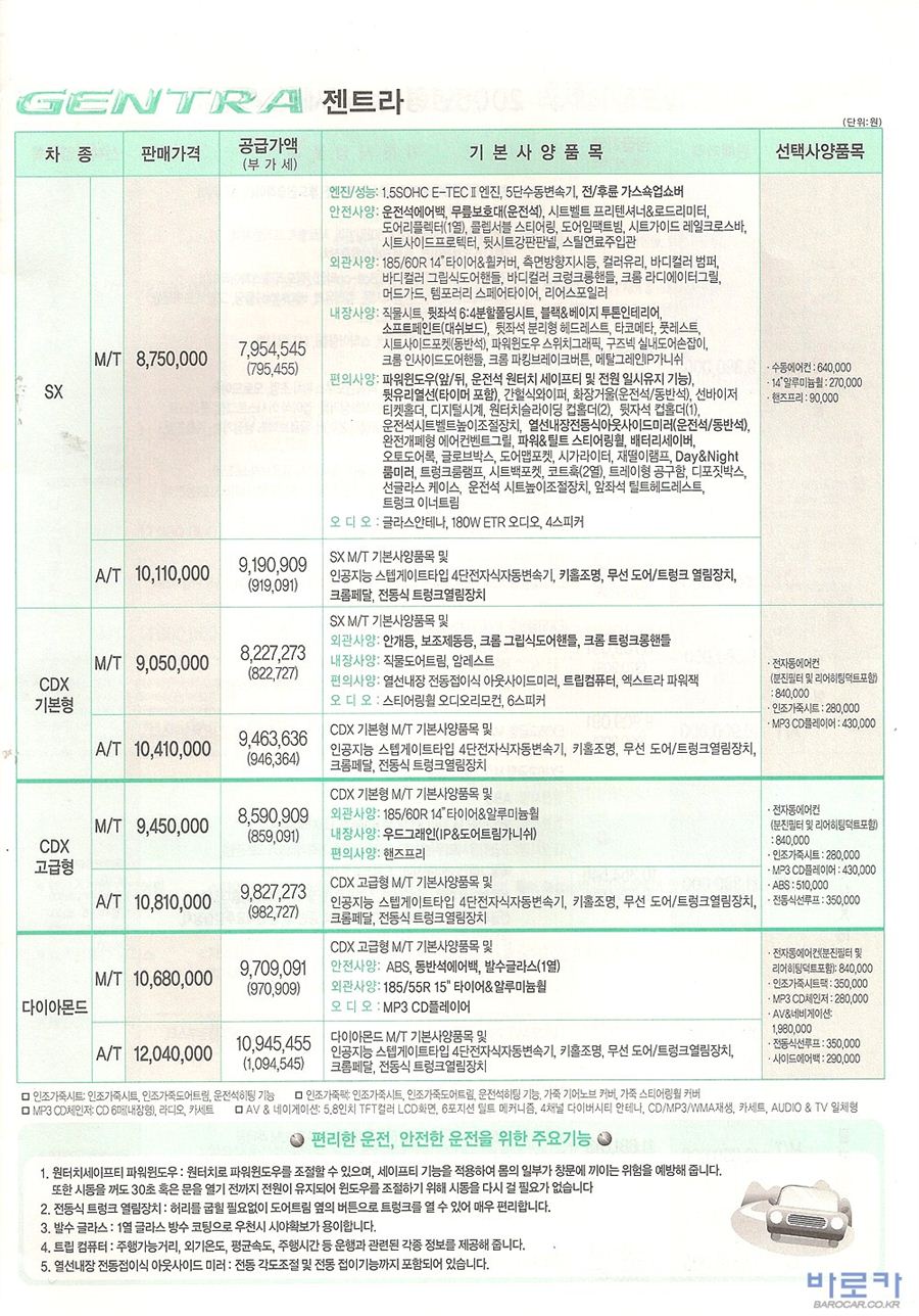 2006년 1월 젠트라 신차가격표