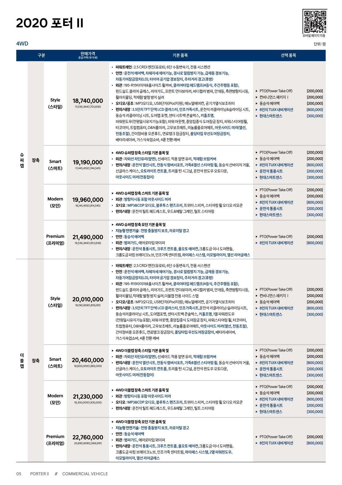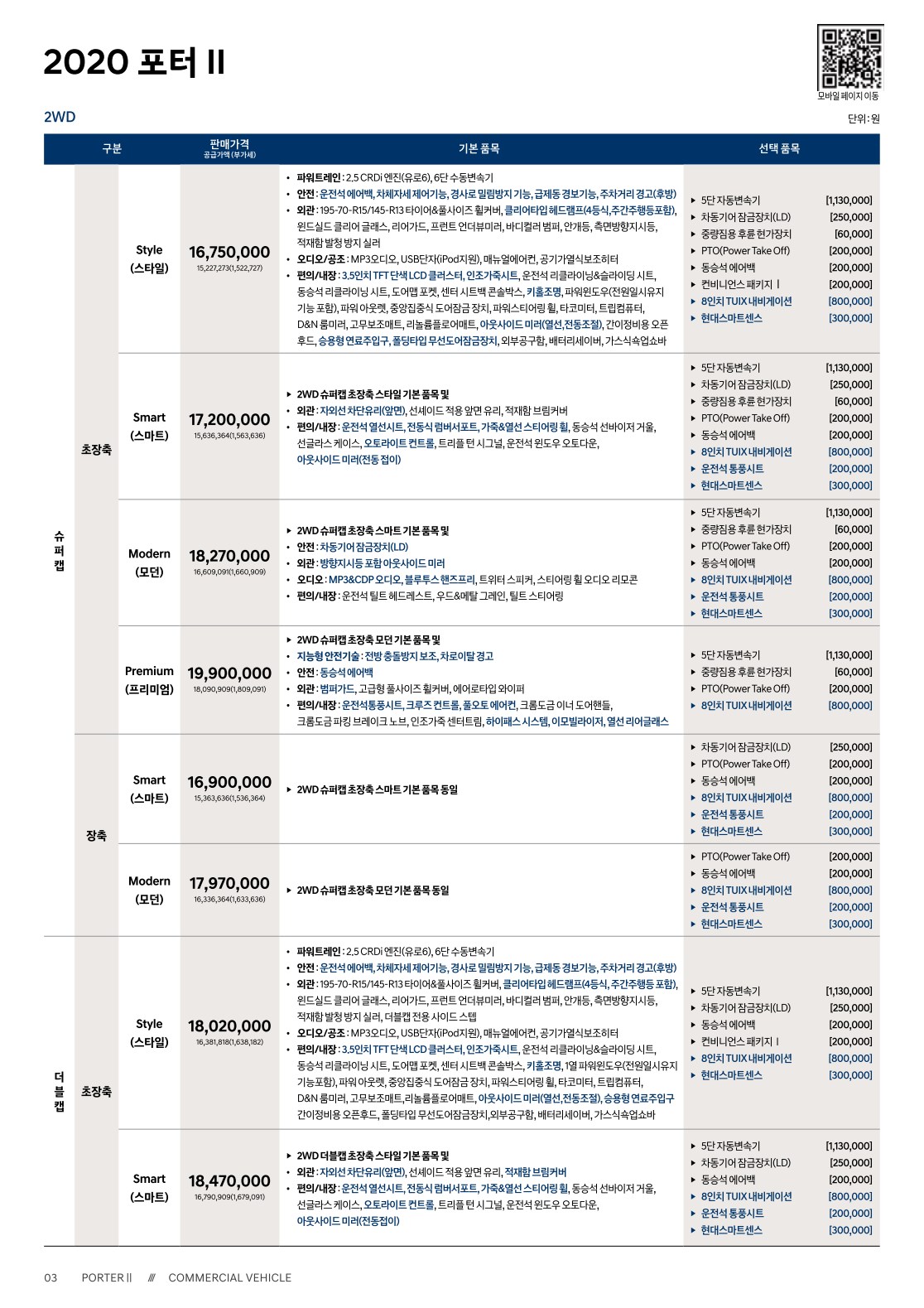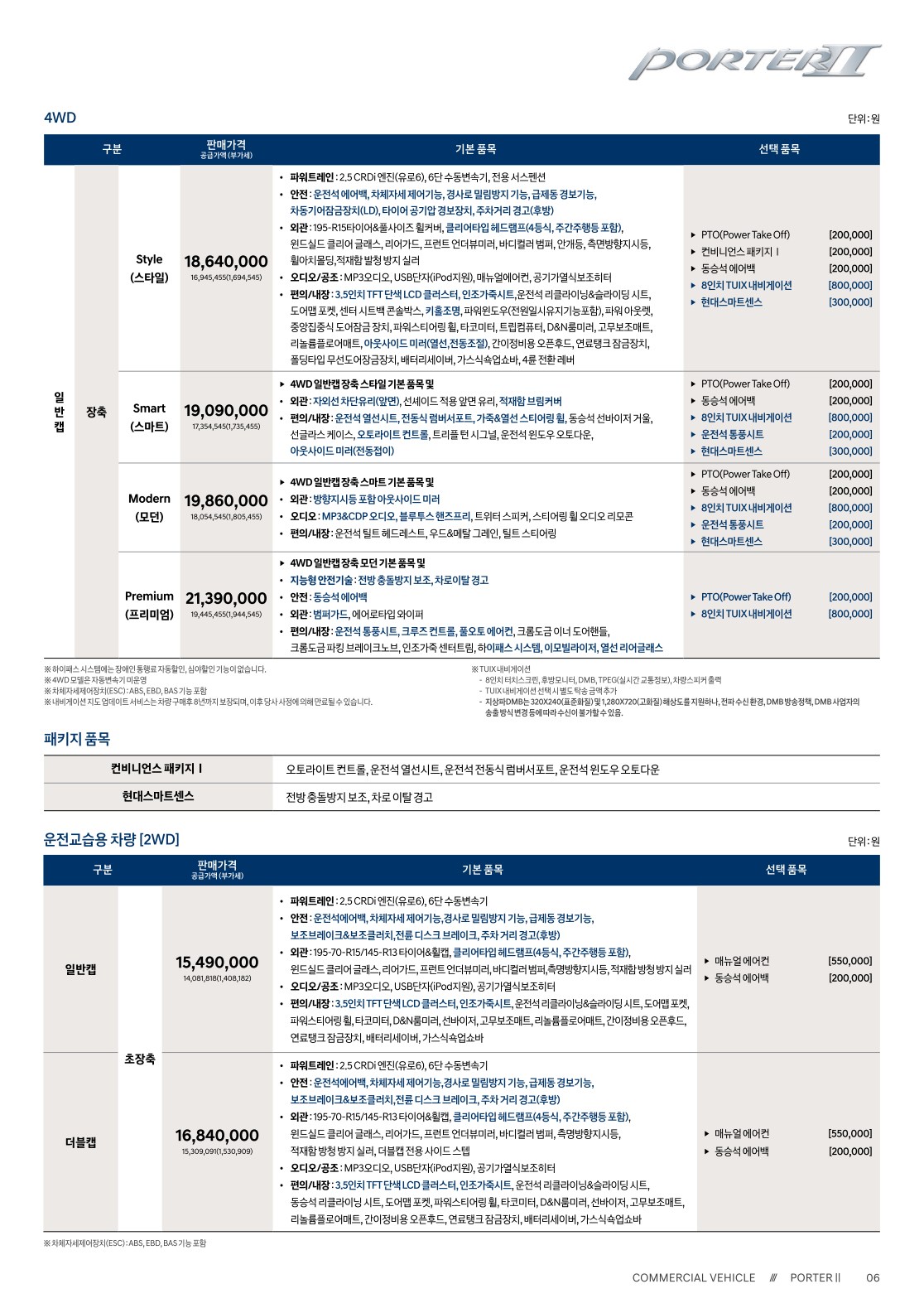 2020년 2월 포터 특장차 (내장탑차,냉장탑차,냉동탑차,파워게이트,윙바디,활어차,주유차,덤프,시티밴) 신차가격표