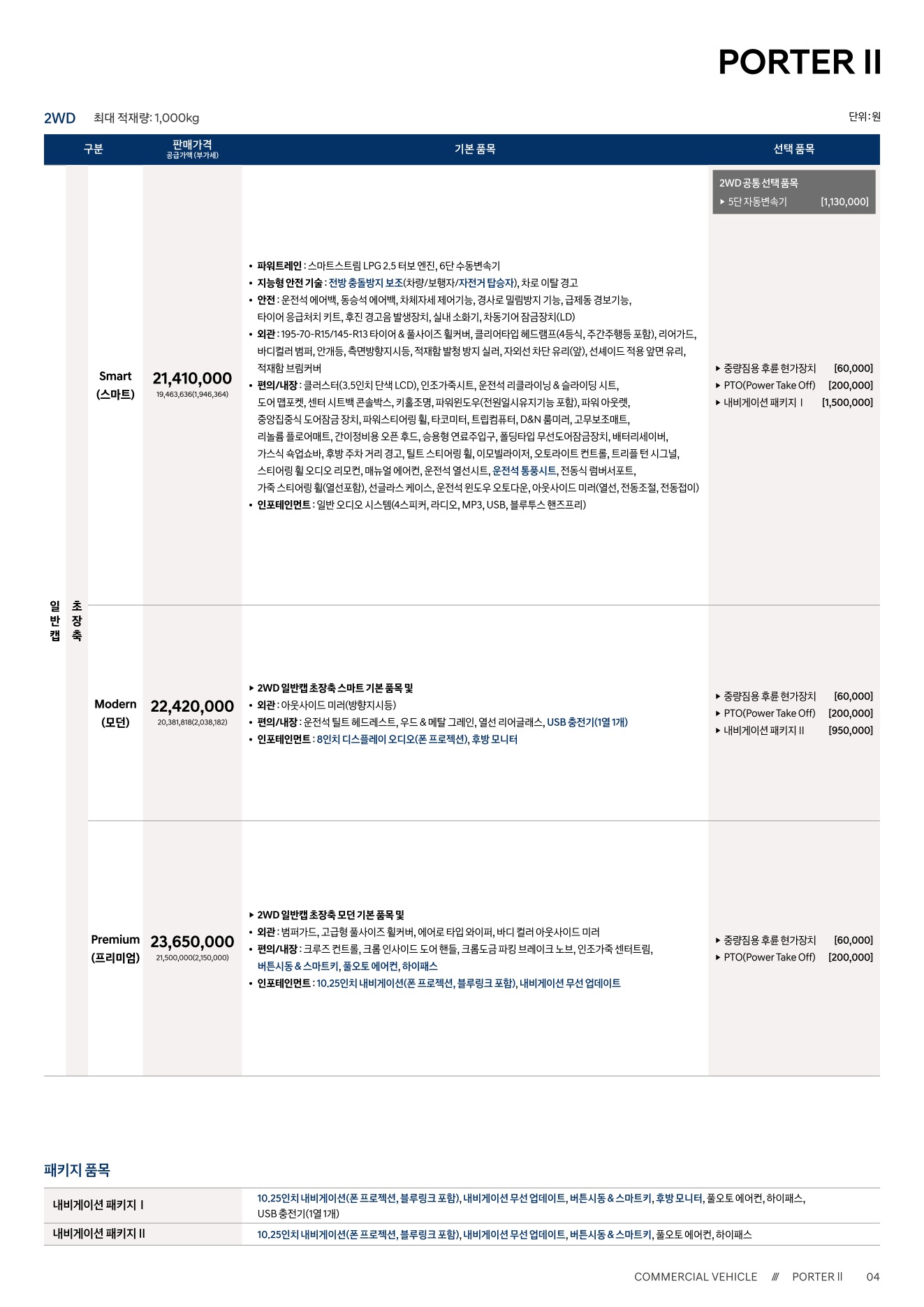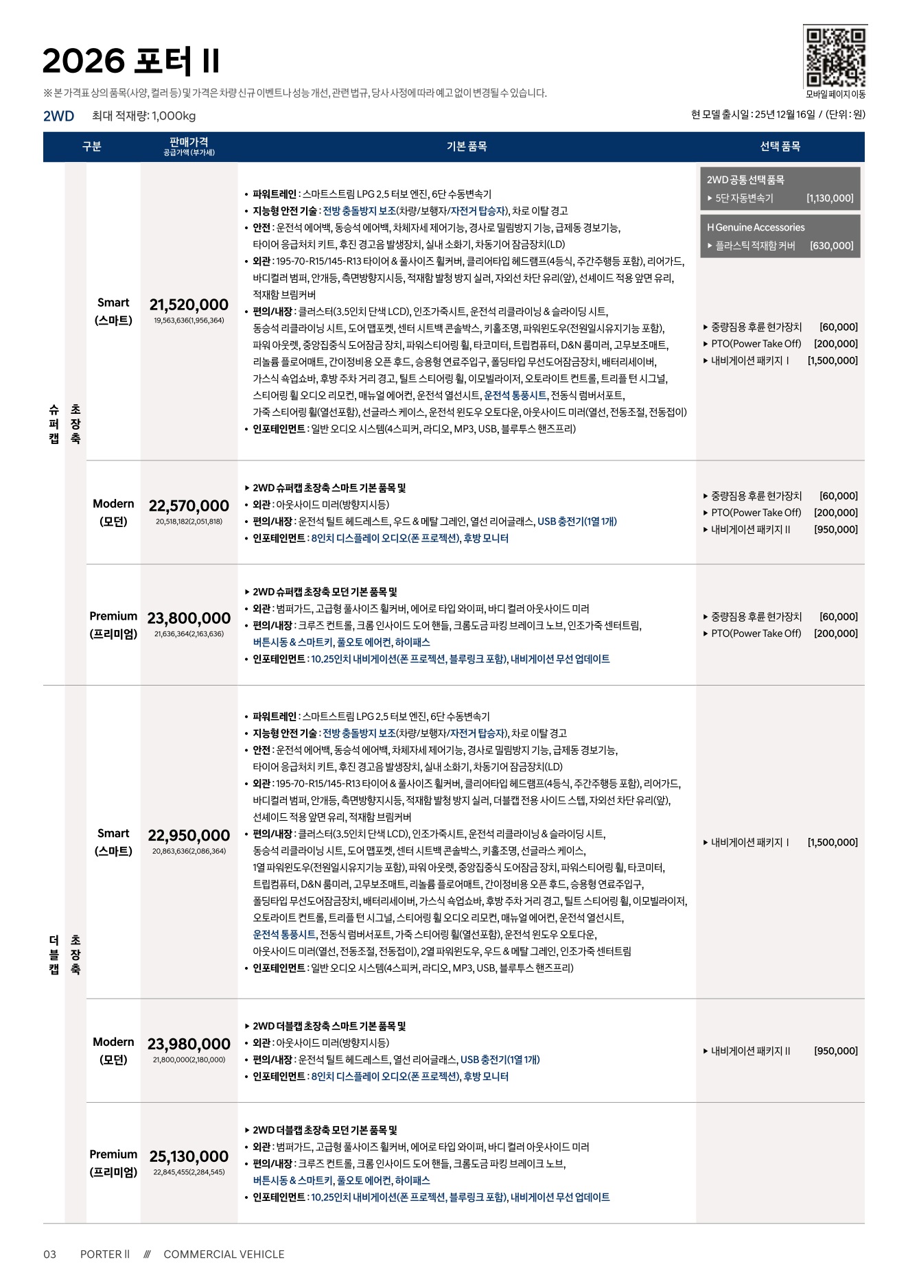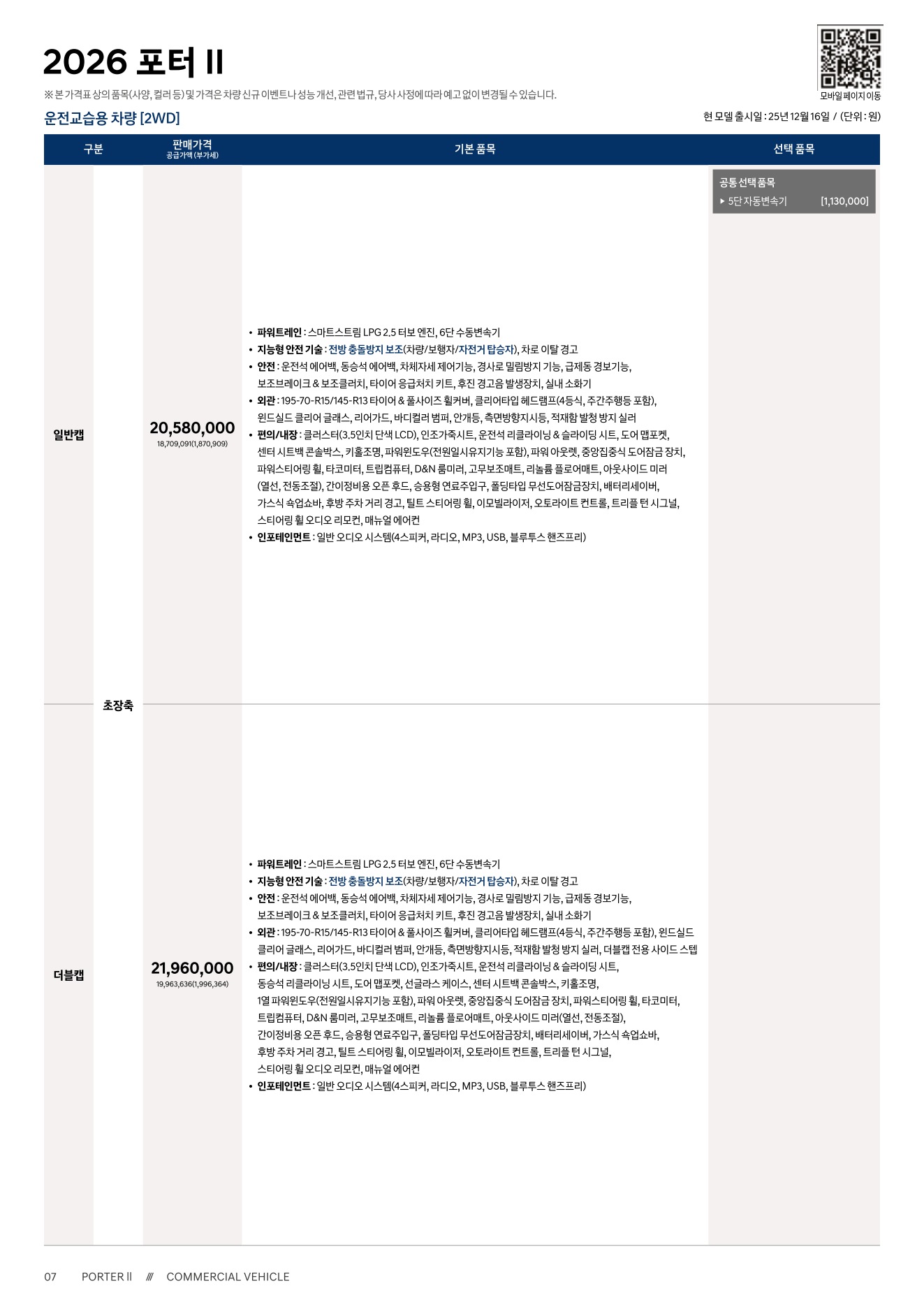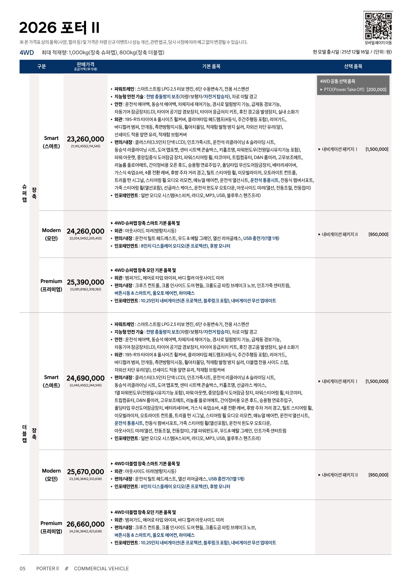 2025년 12월 포터2 신차가격표 (2026년형 포터2)
