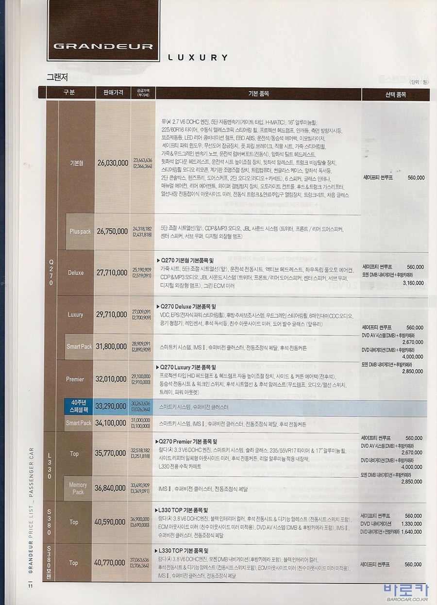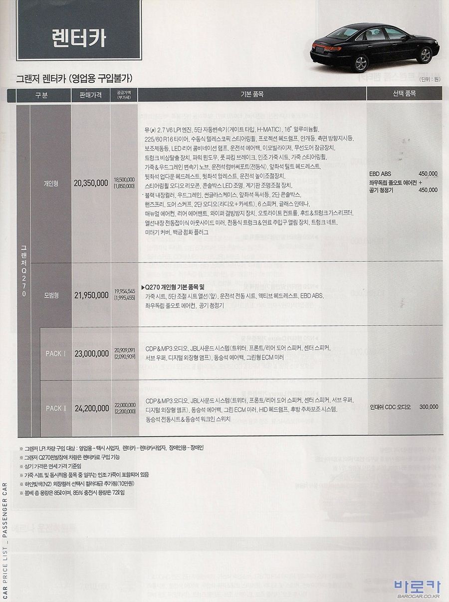 2007년 10월 그랜져TG 신차가격표 (LPG포함)