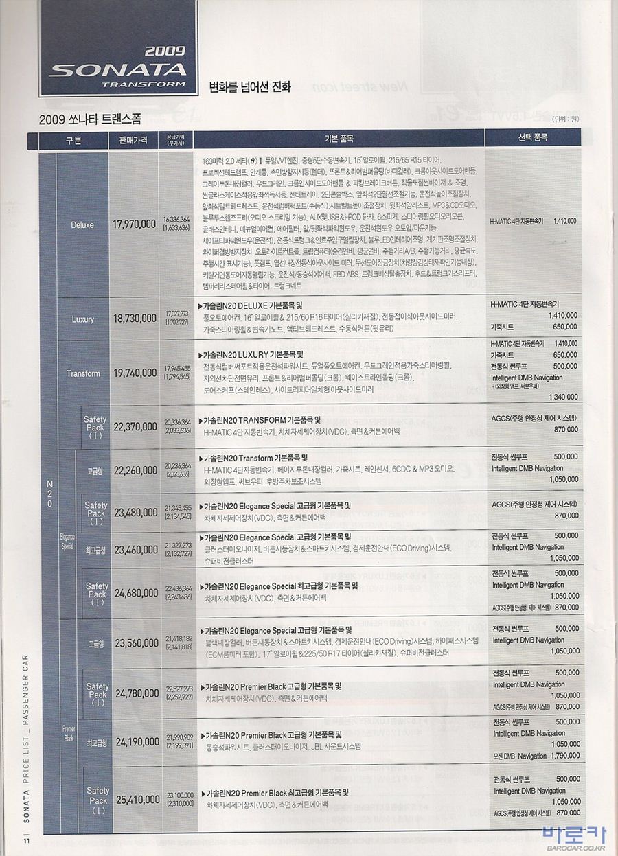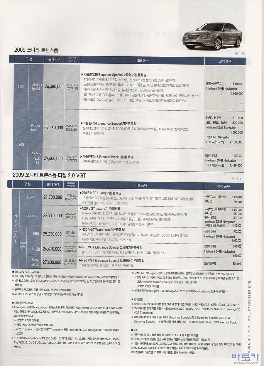 2009년 3월 NF쏘나타 트랜스폼 신차가격표 (LPG포함)