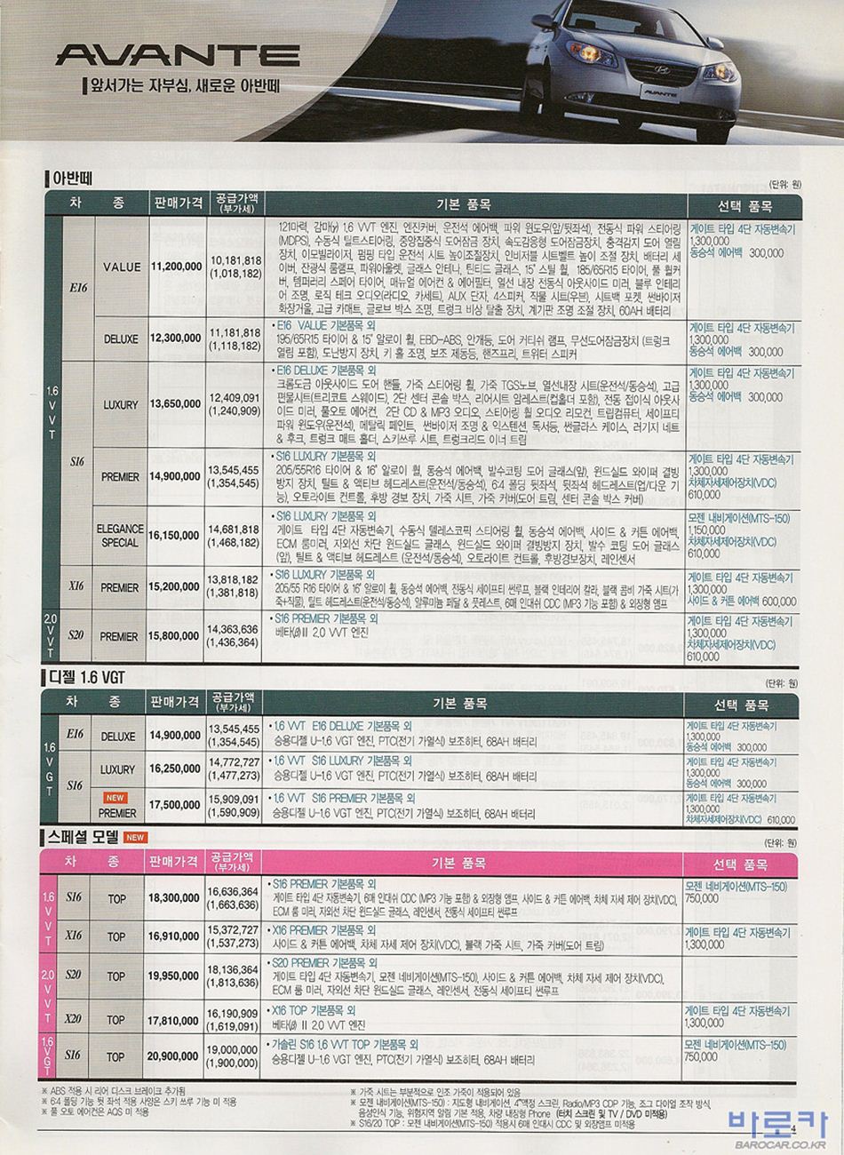 2006년 9월 아반떼HD 신차가격표
