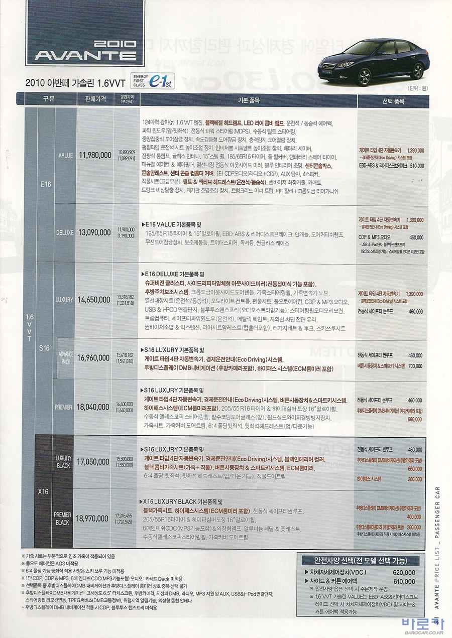 2009년 8월 아반떼HD LPi 하이브리드 신차가격표