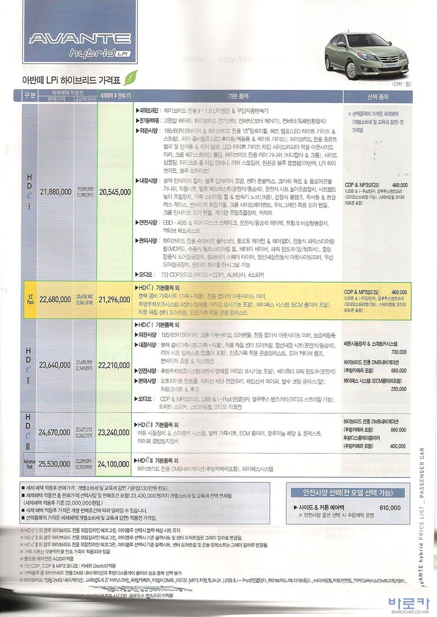 2009년 11월 아반떼HD LPi 하이브리드 신차가격표