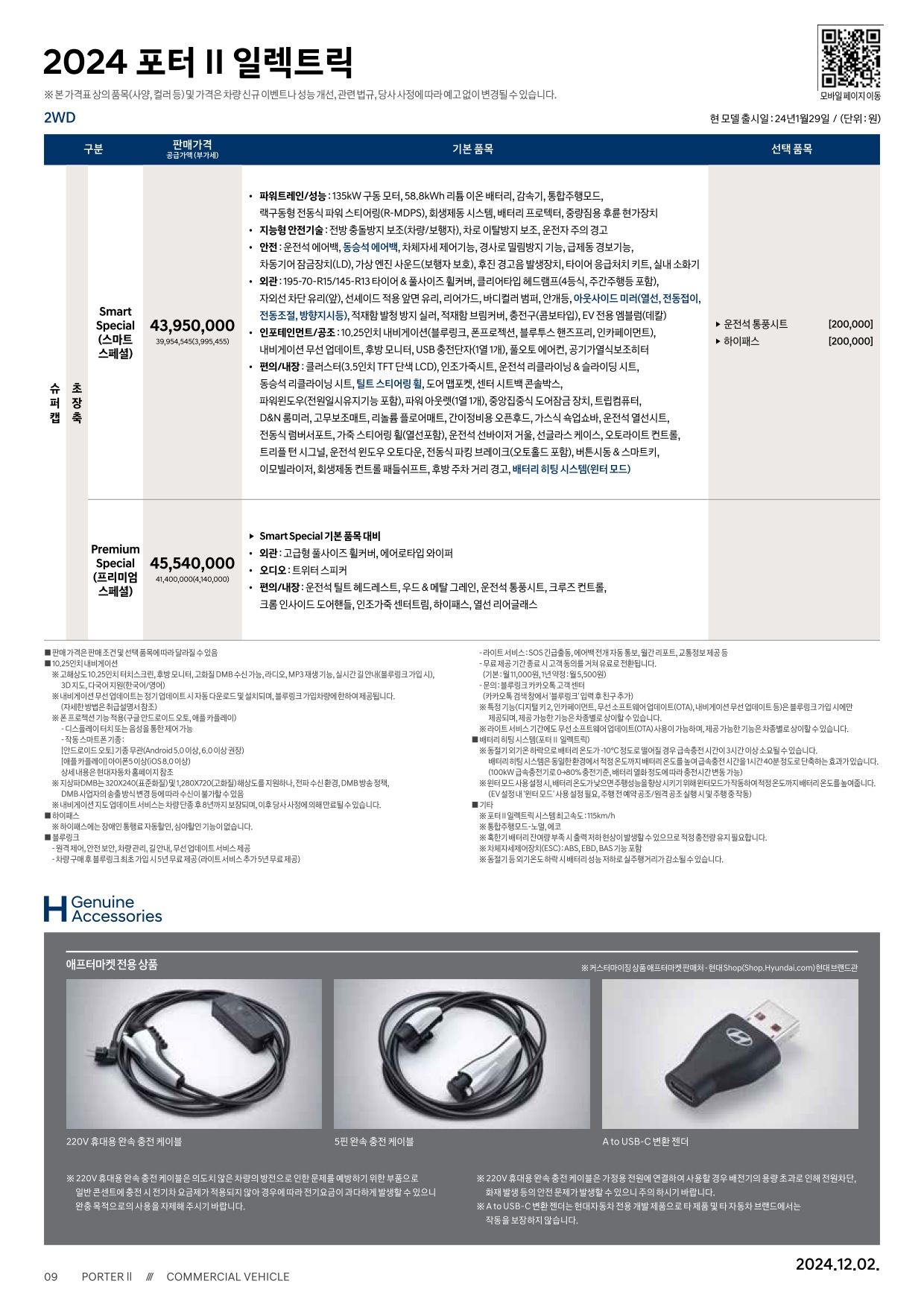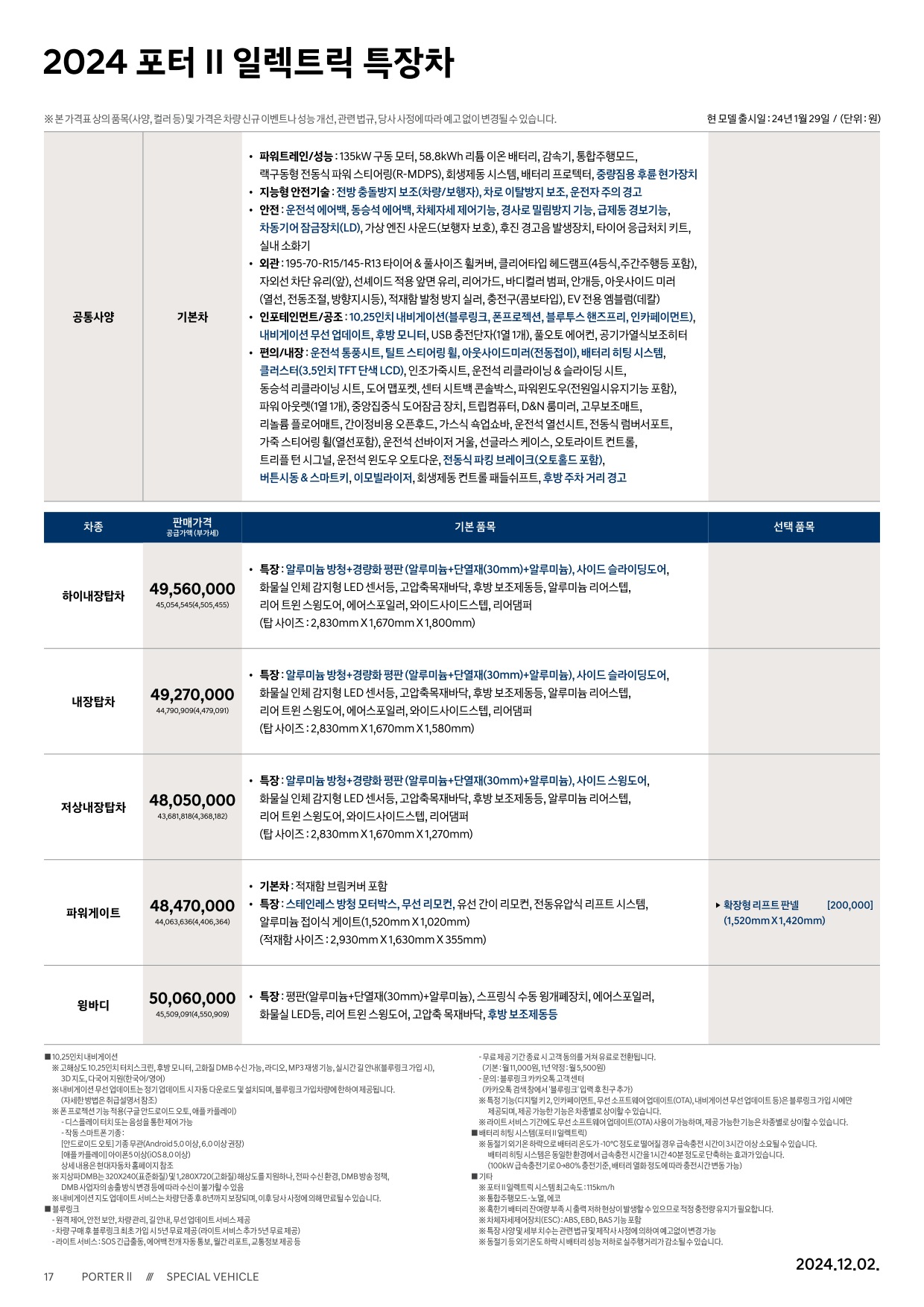 2024년 12월 포터 일렉트릭 & 포터 일렉트릭 특장차 신차가격표