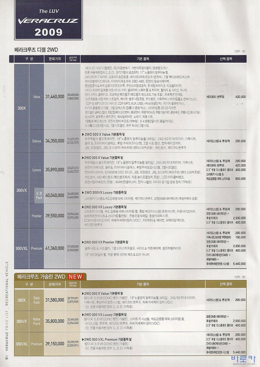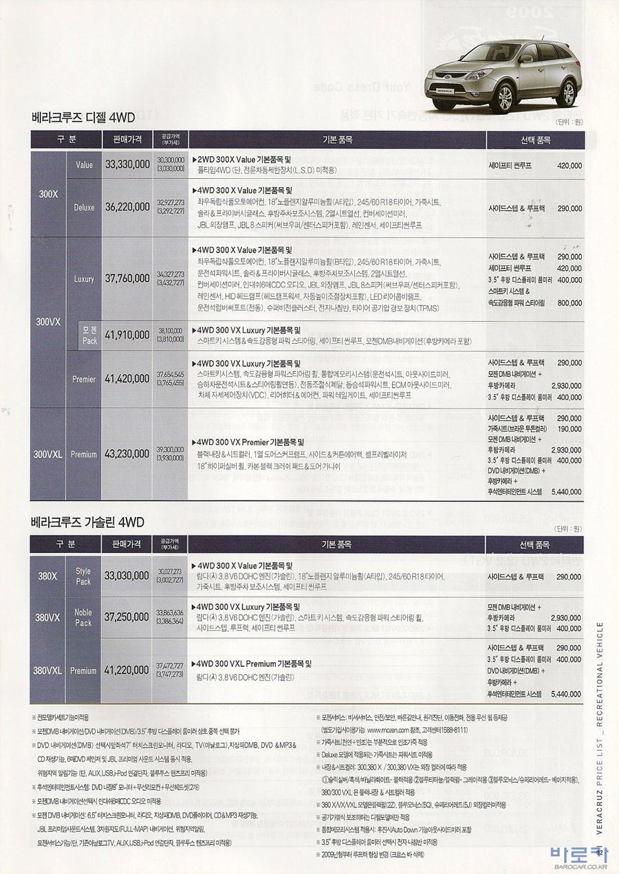 2009년 9월 베라크루즈 신차가격표