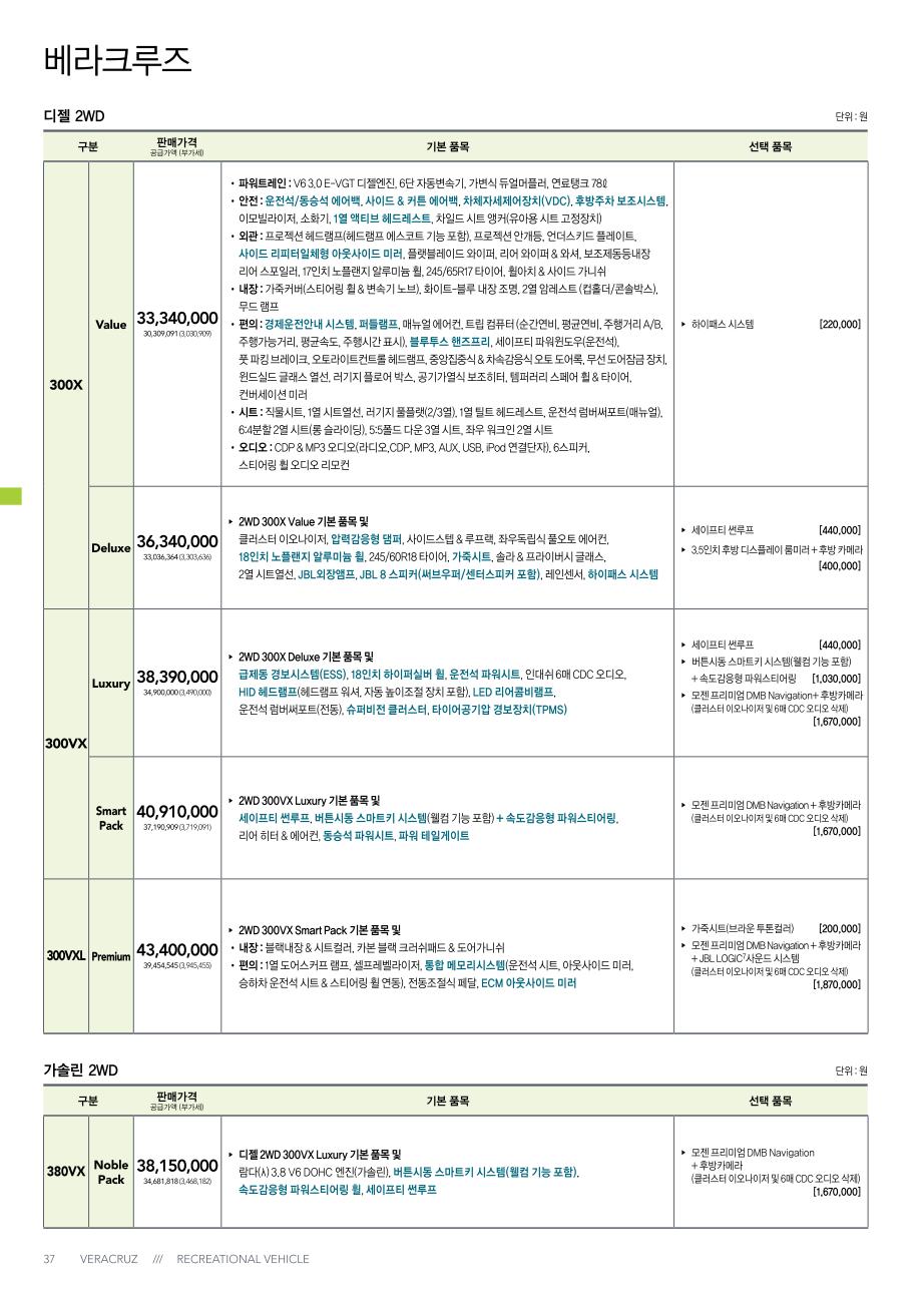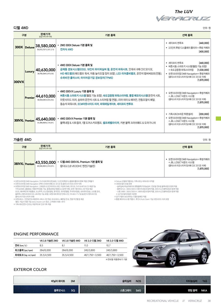 2012년 1월 베라크루즈 신차가격표 (255마력 디젤)