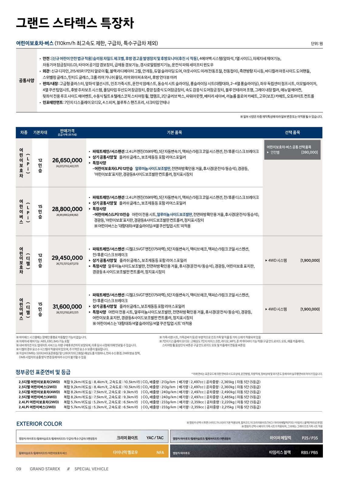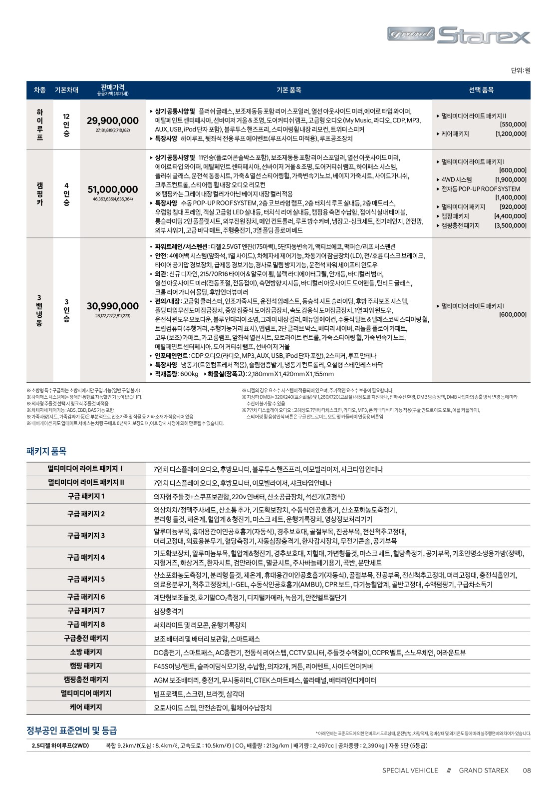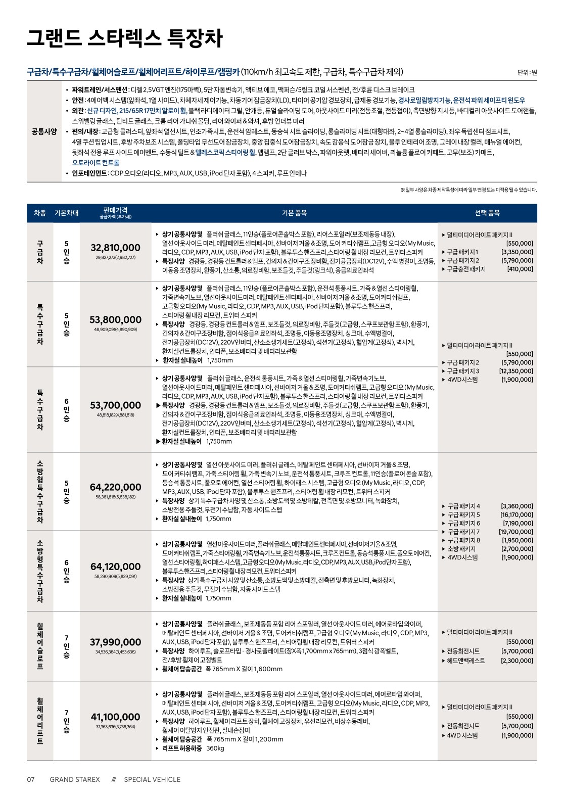 2020년 2월 그랜드 스타렉스 특장차 (구급차/휠체어/하이루프/캠핑카) 신차가격표