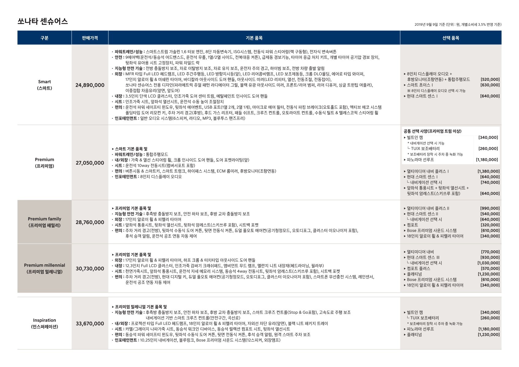 2019년 9월 쏘나타 신차가격표 (쏘나타 센슈어스 1.6터보 출시)