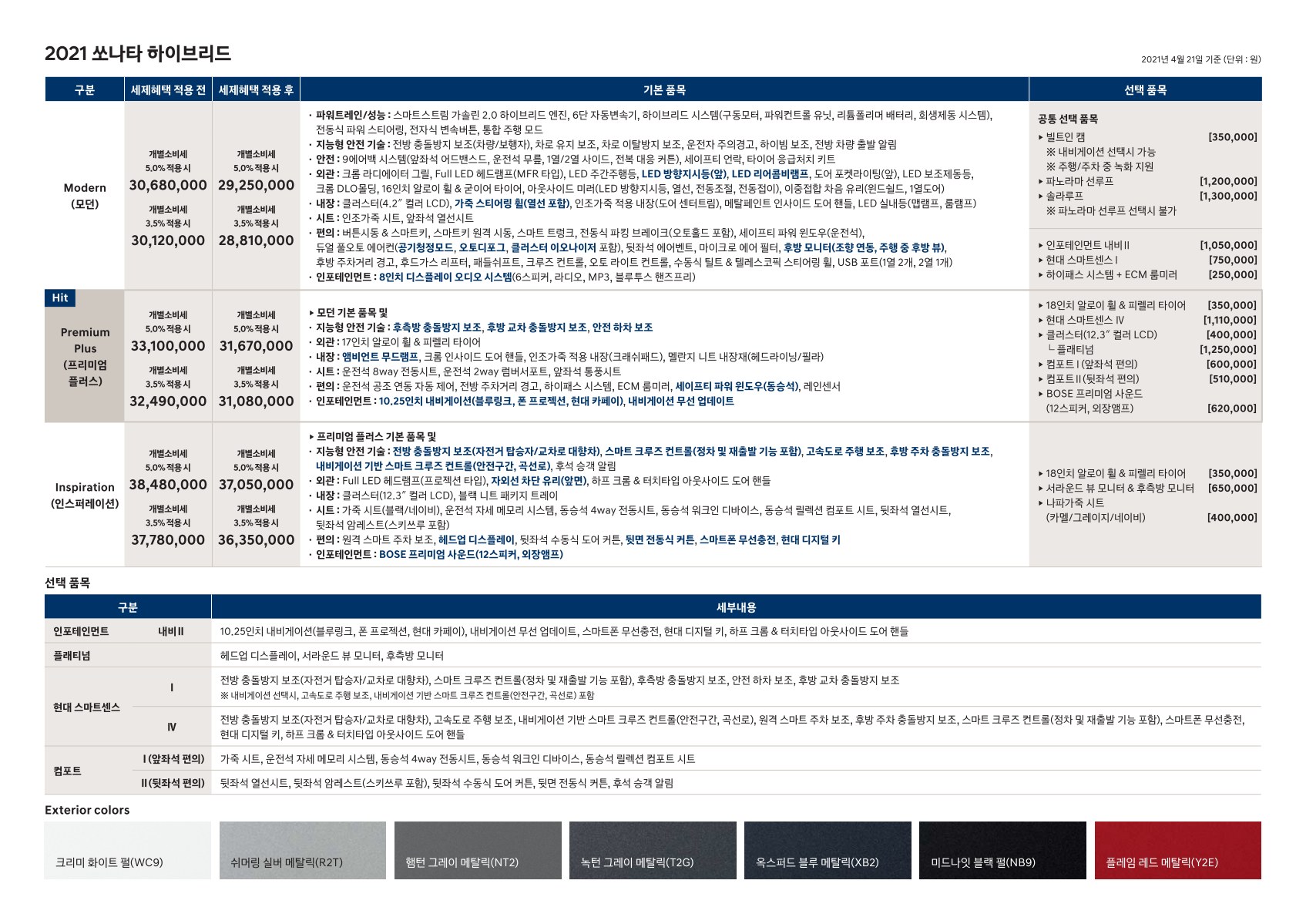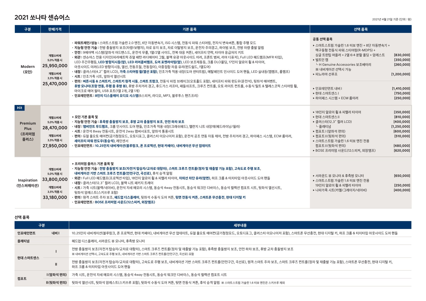 2021년 4월 쏘나타 신차가격표 (쏘나타 센슈어스, 하이브리드)