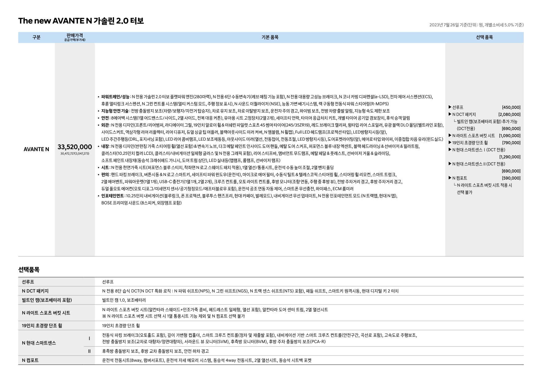 2023년 7월 아반떼N 신차가격표 (아반떼N 부변변경 출시)