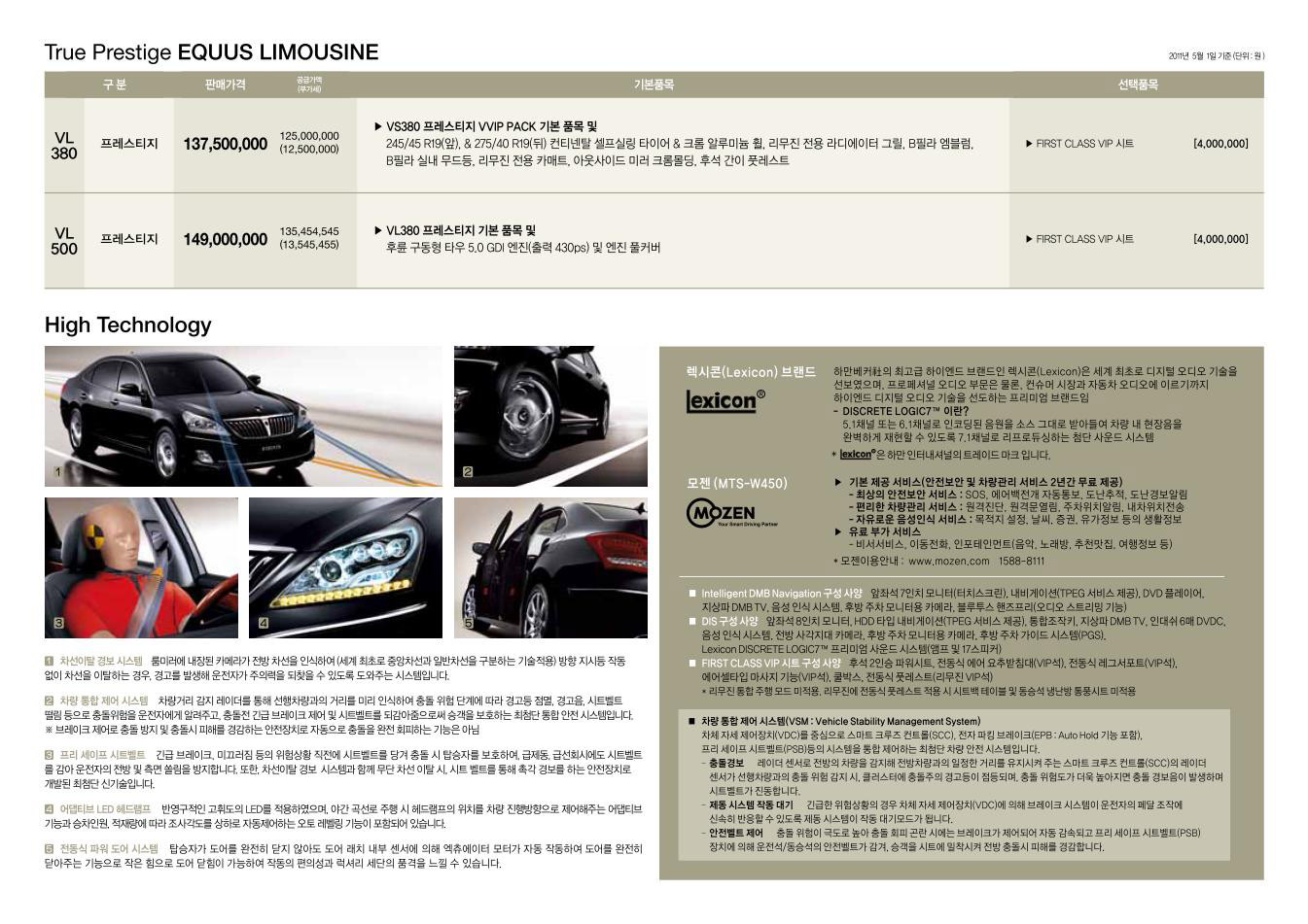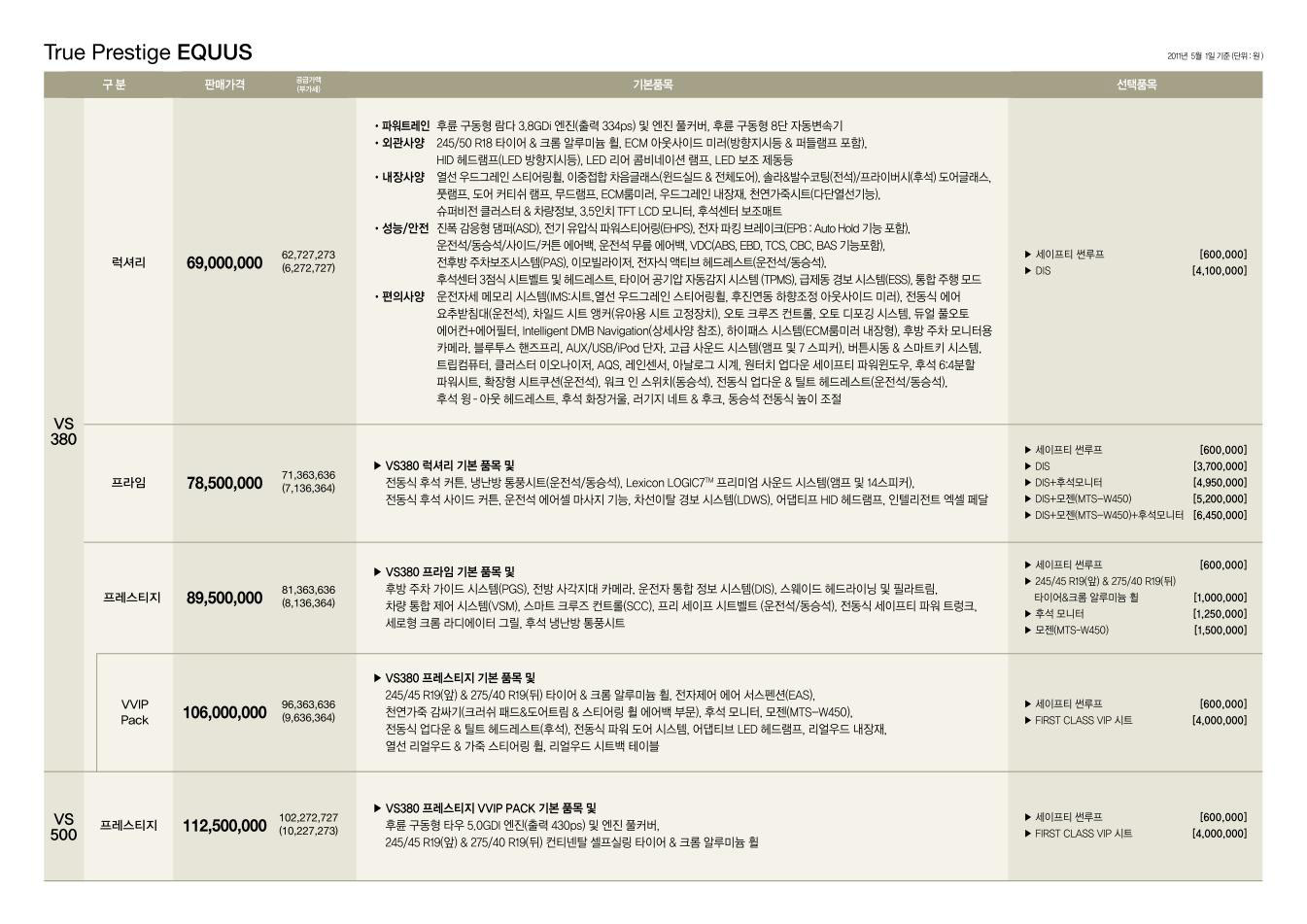 2011년 5월 뉴 에쿠스 신차가격표 (GDi 엔진 / 8단 미션 탑재)