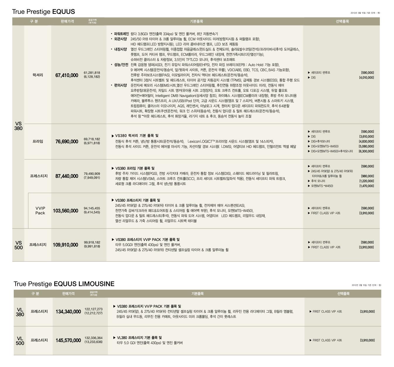 2012년 3월 에쿠스 신차가격표 (FTA 개별소비세인하 반영)