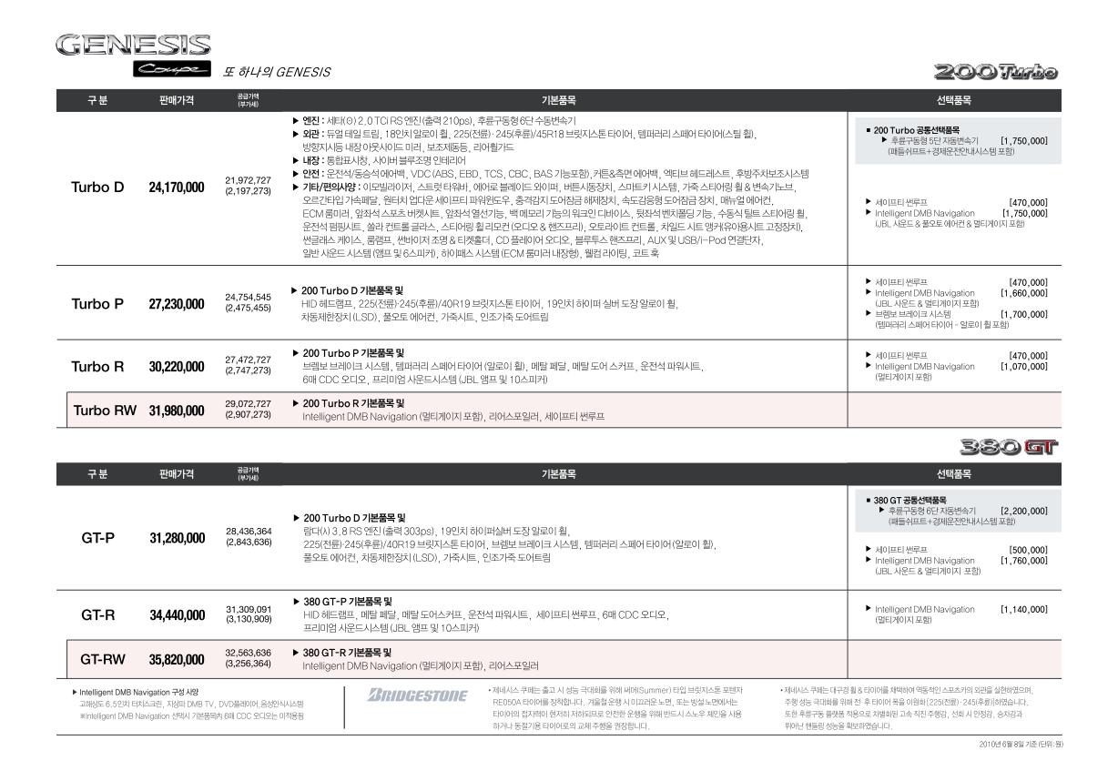 2010년 6월 제네시스 쿠페 신차가격표