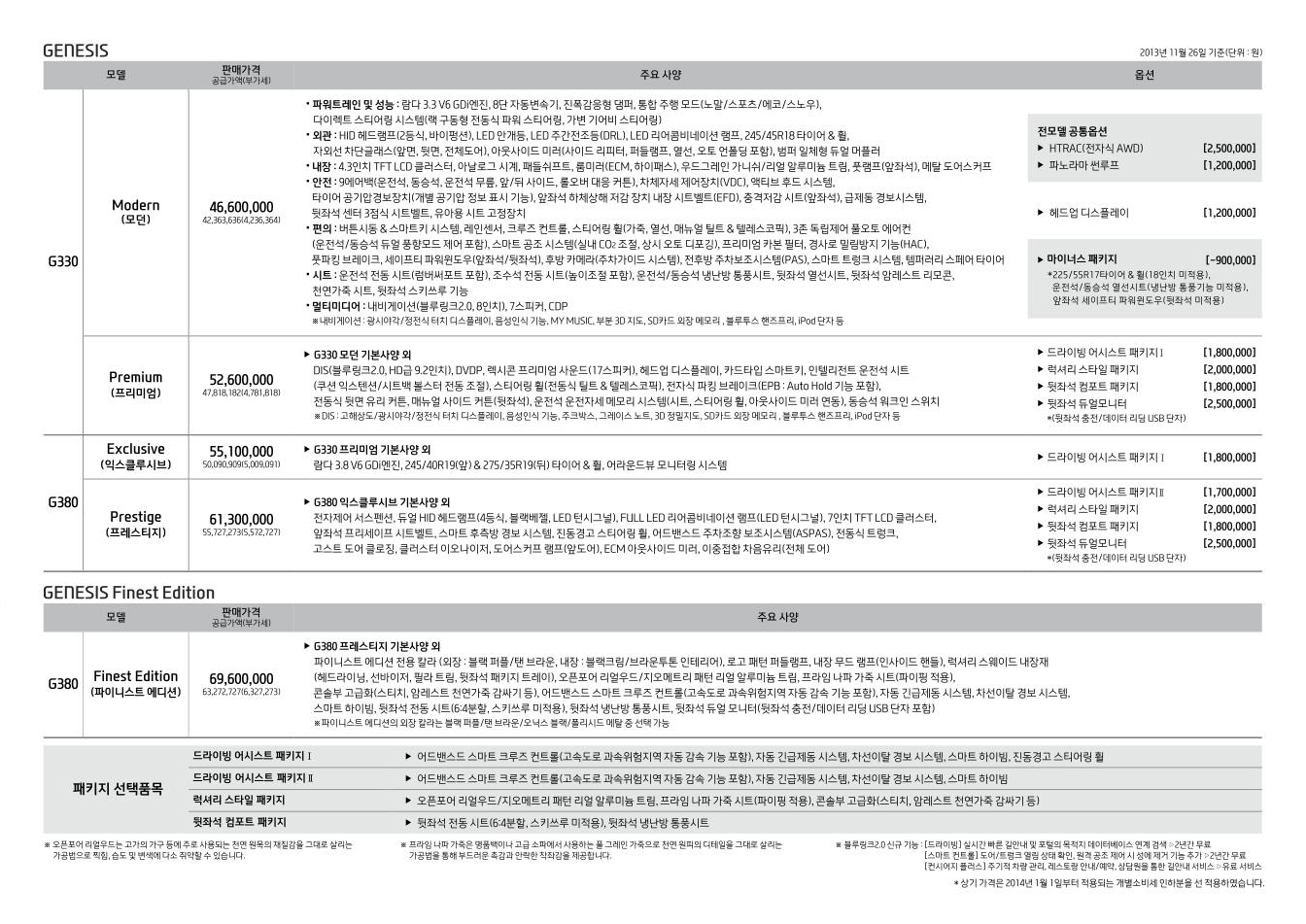 2013년 11월 신형 제네시스 (제네시스DH) 신차가격표