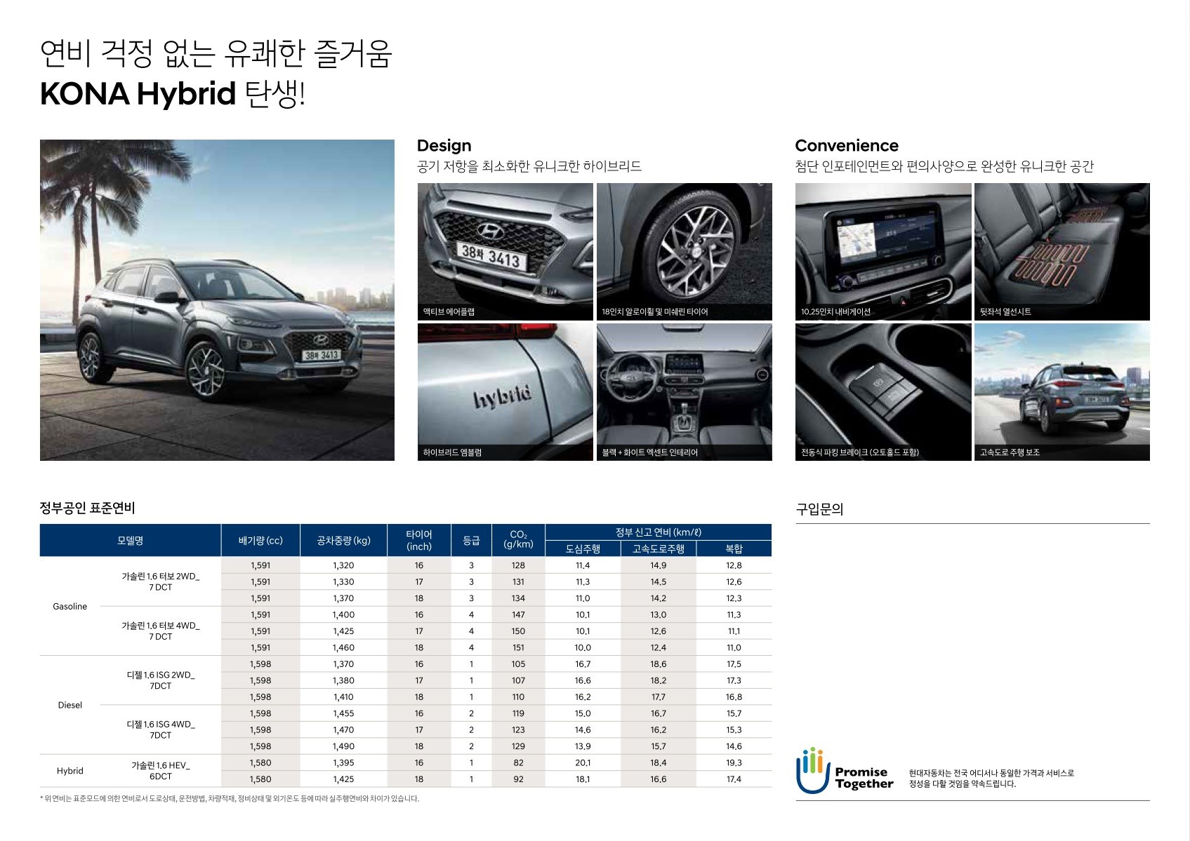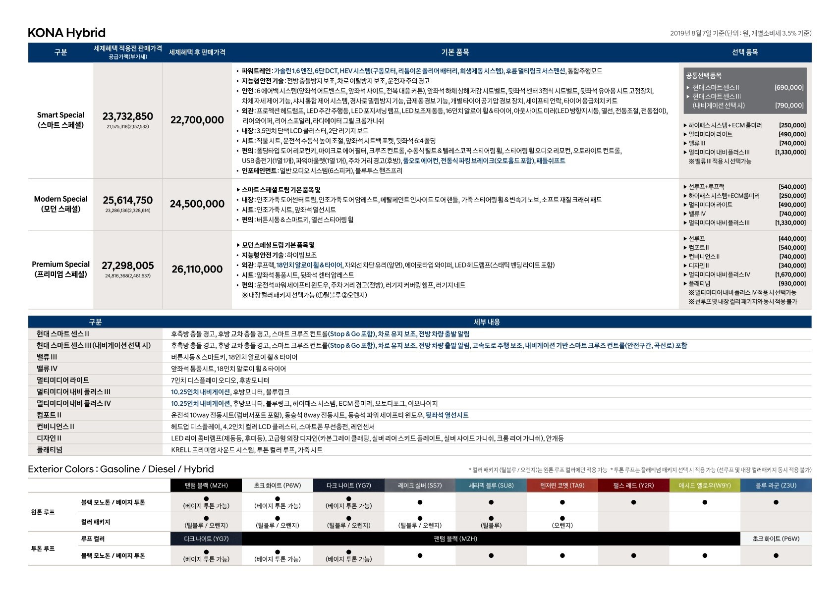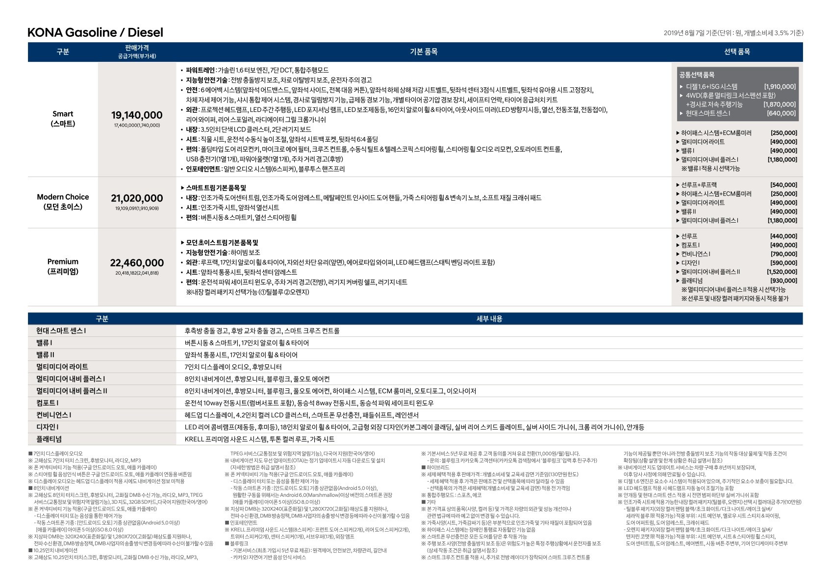 2019년 8월 코나 가격표 / 코나 하이브리드 가격표