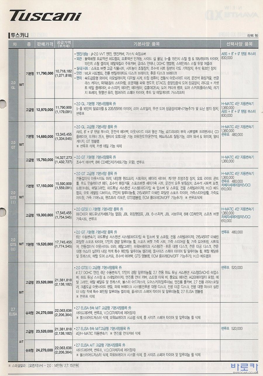 2005년 4월 투스카니(F/L1) 신차가격표
