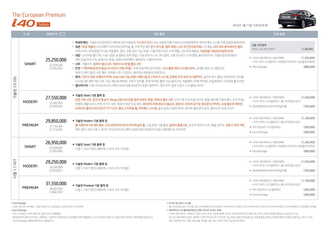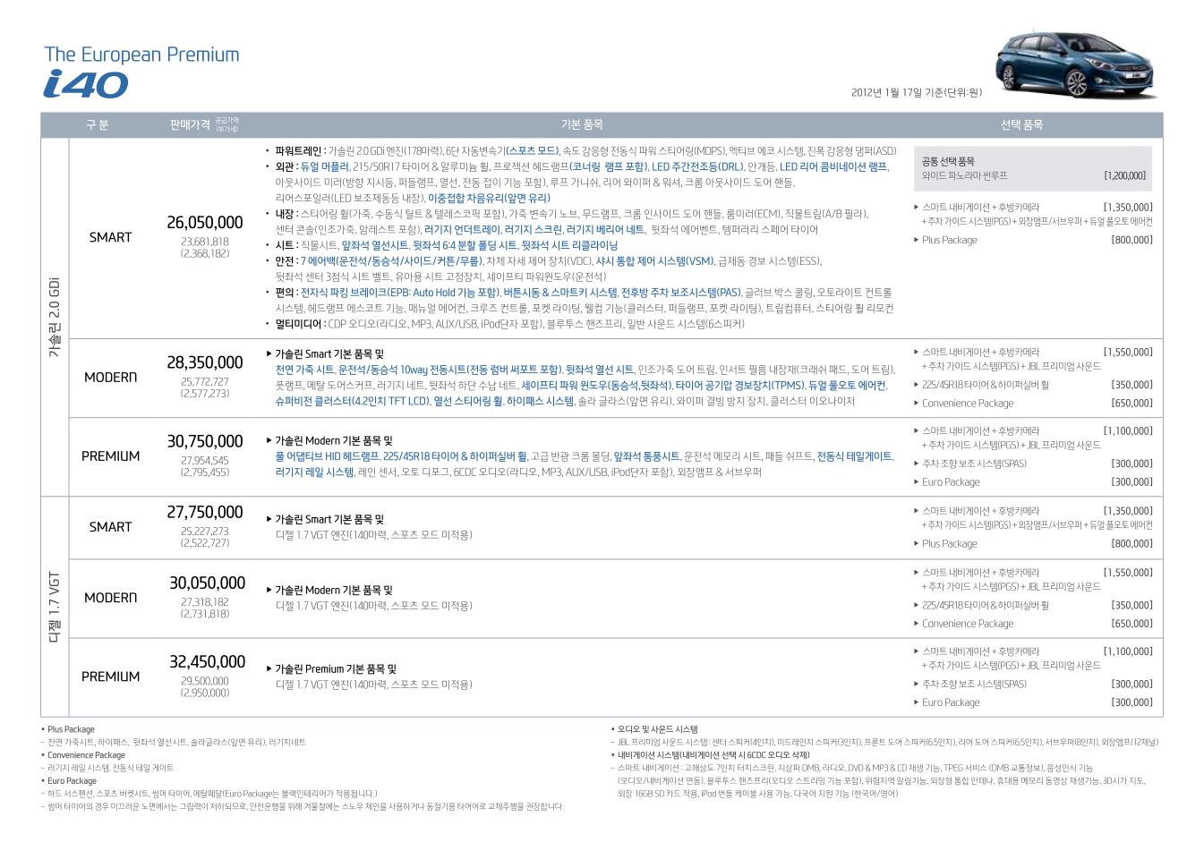2012년 1월 i40 세단(살롱) / 왜건 신차가격표