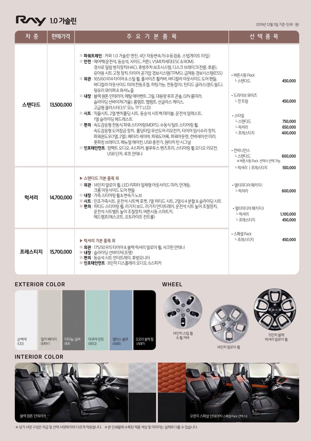 2019년 12월 레이 신차가격표 (2020년형 레이 출시)