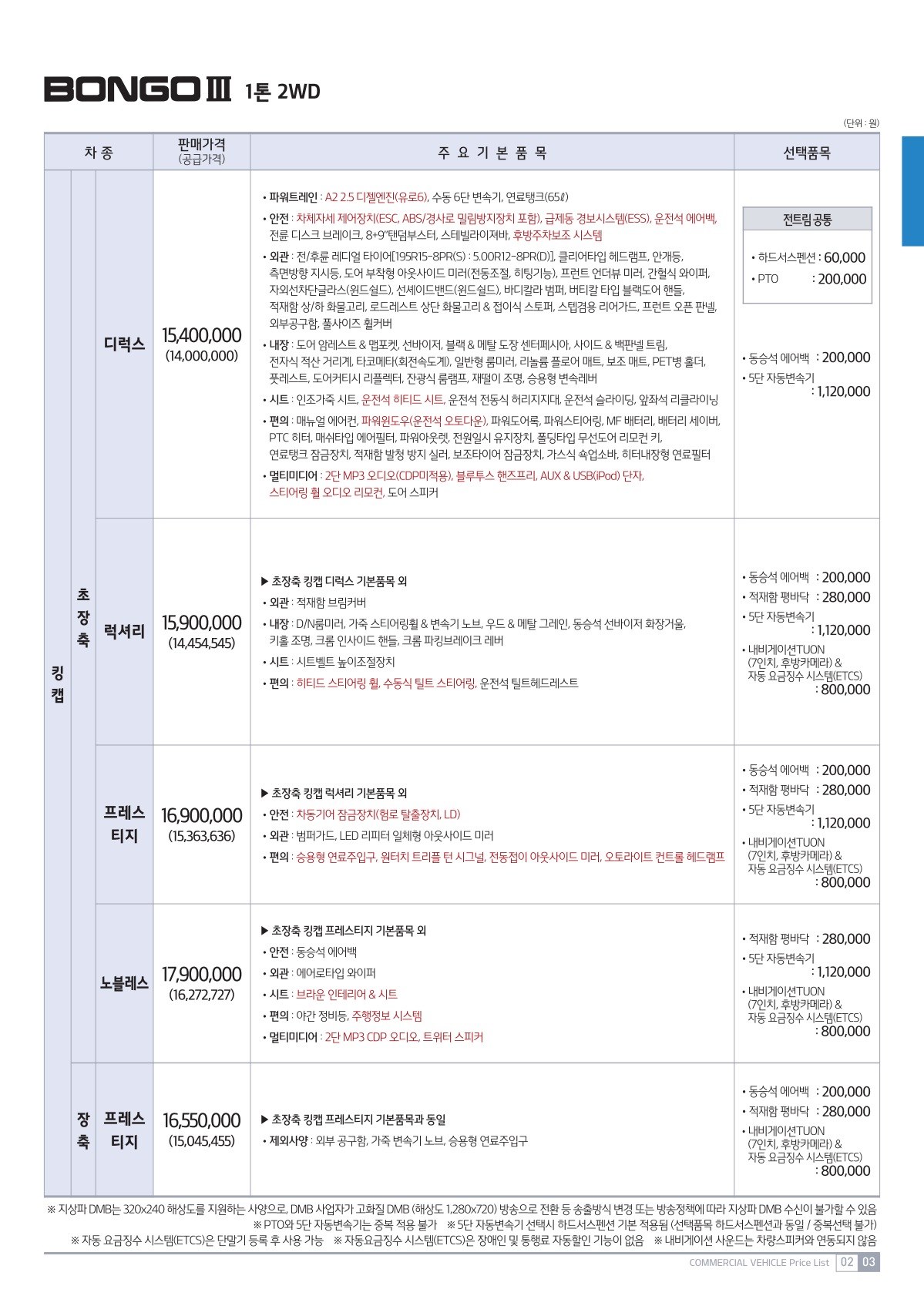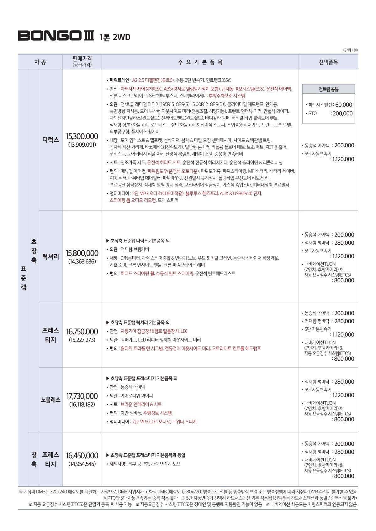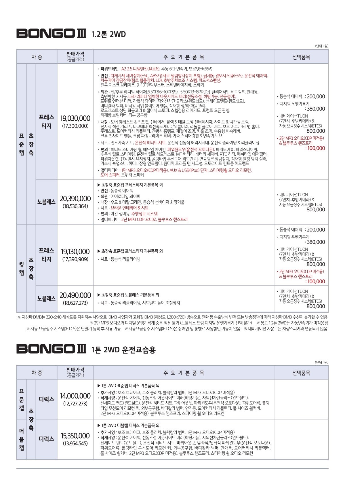 2018년 10월 봉고3 신차가격표 (2019년형)