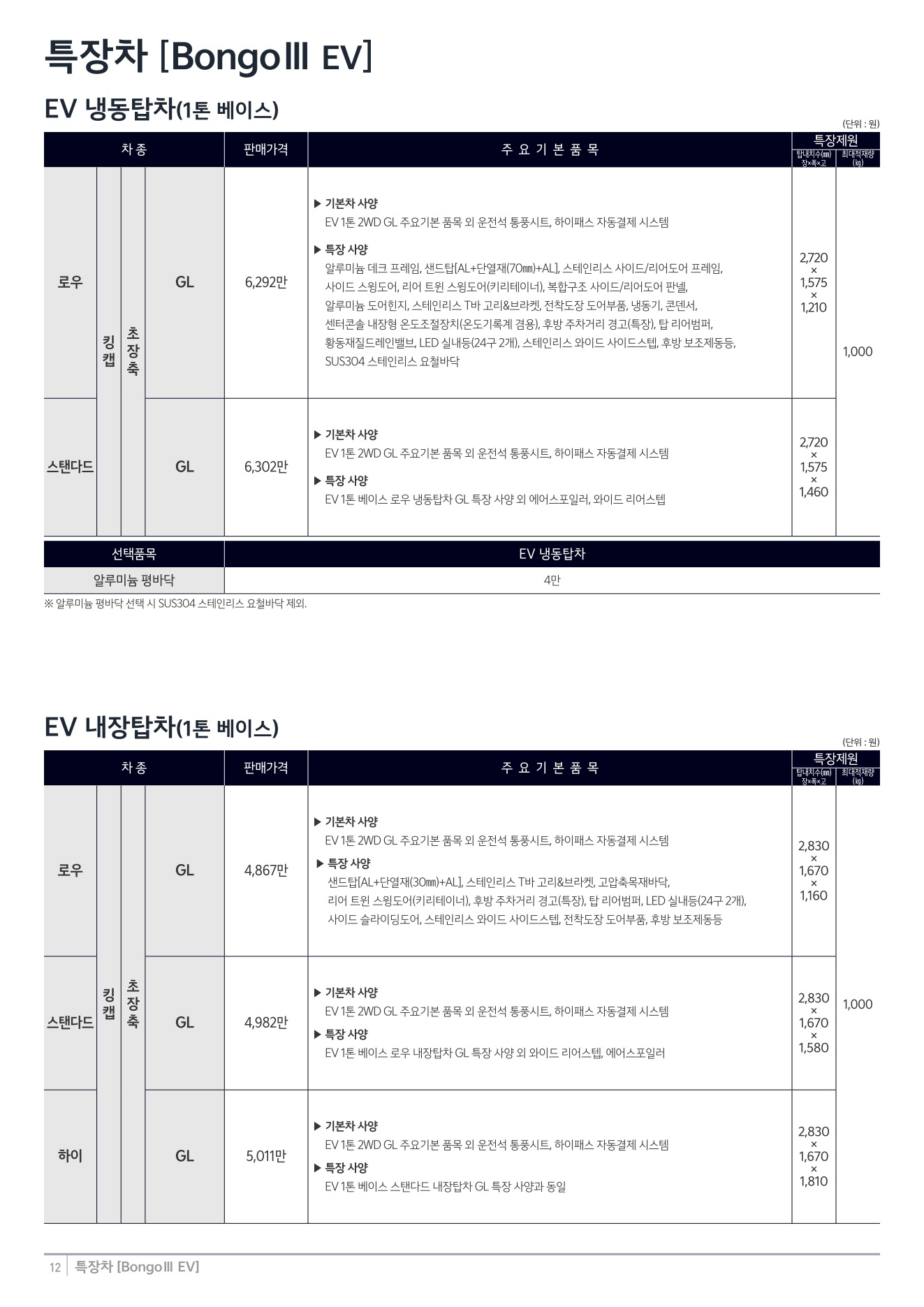 2025년 12월 봉고3 EV 특장차 신차가격표