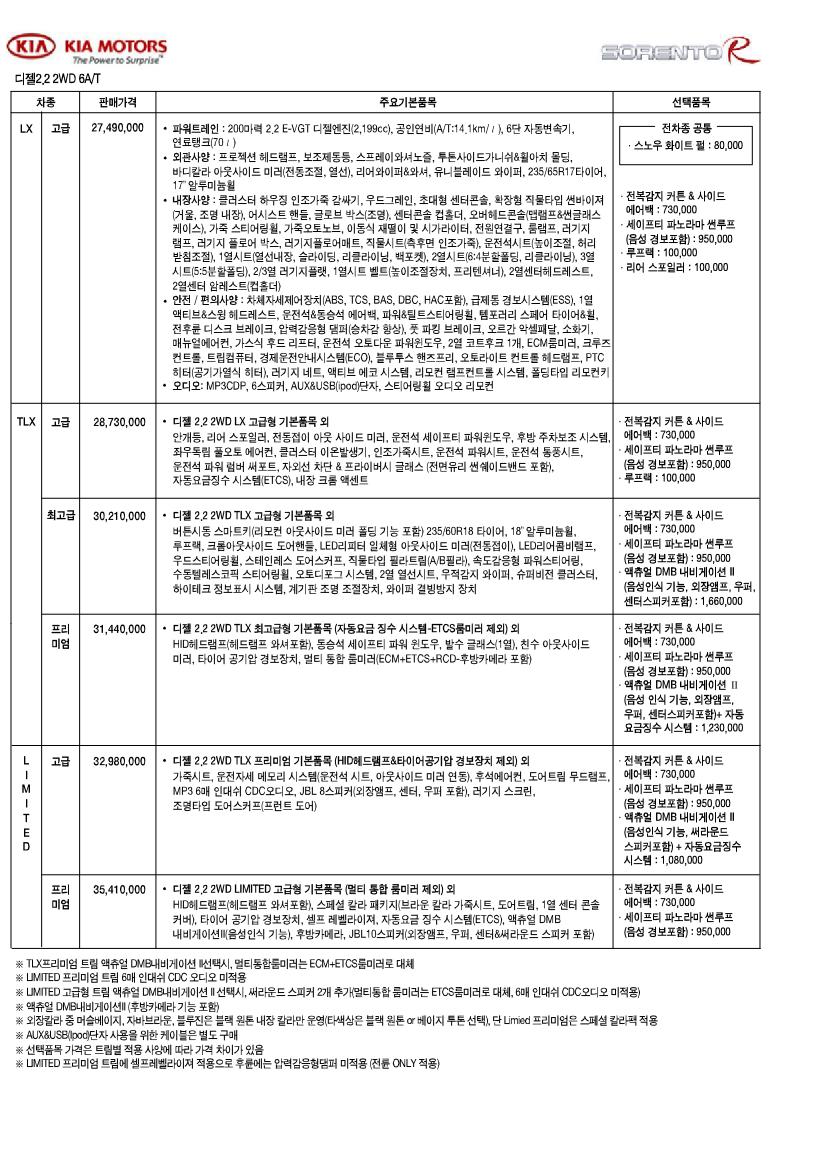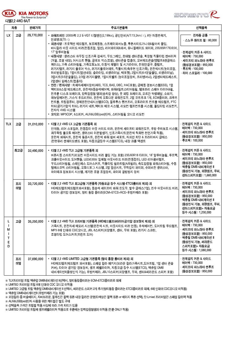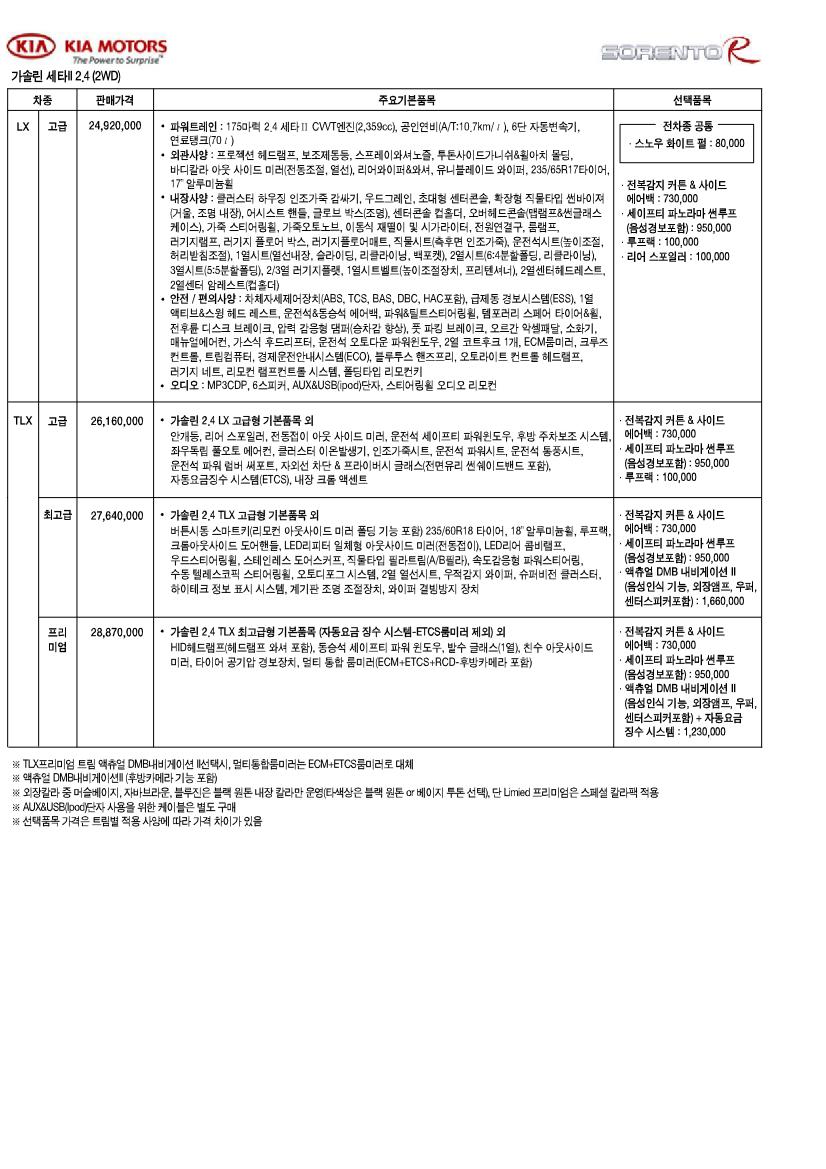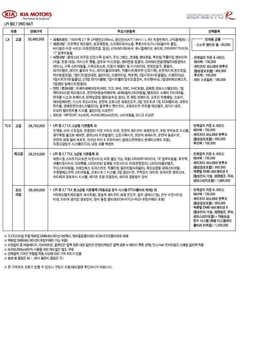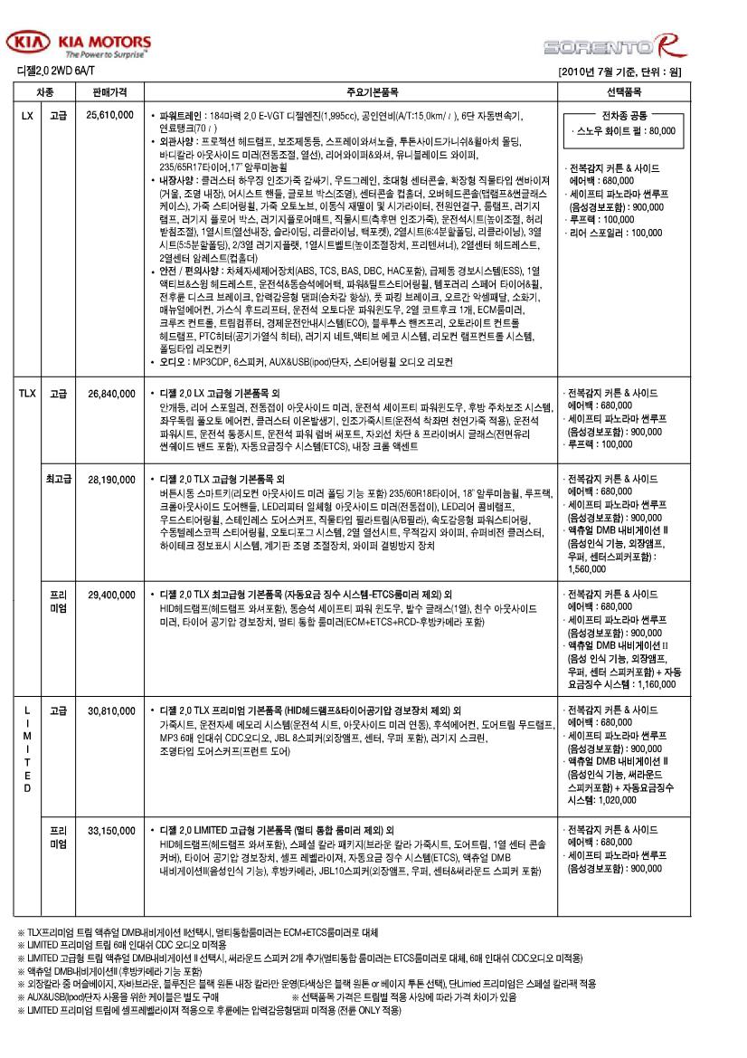 2010년 12월 쏘렌토R 신차가격표 (2011년형)