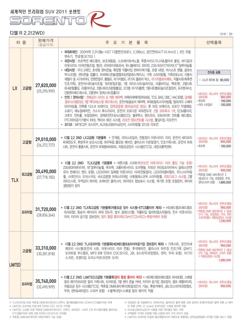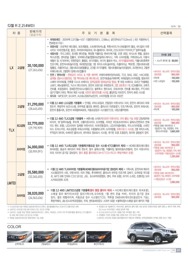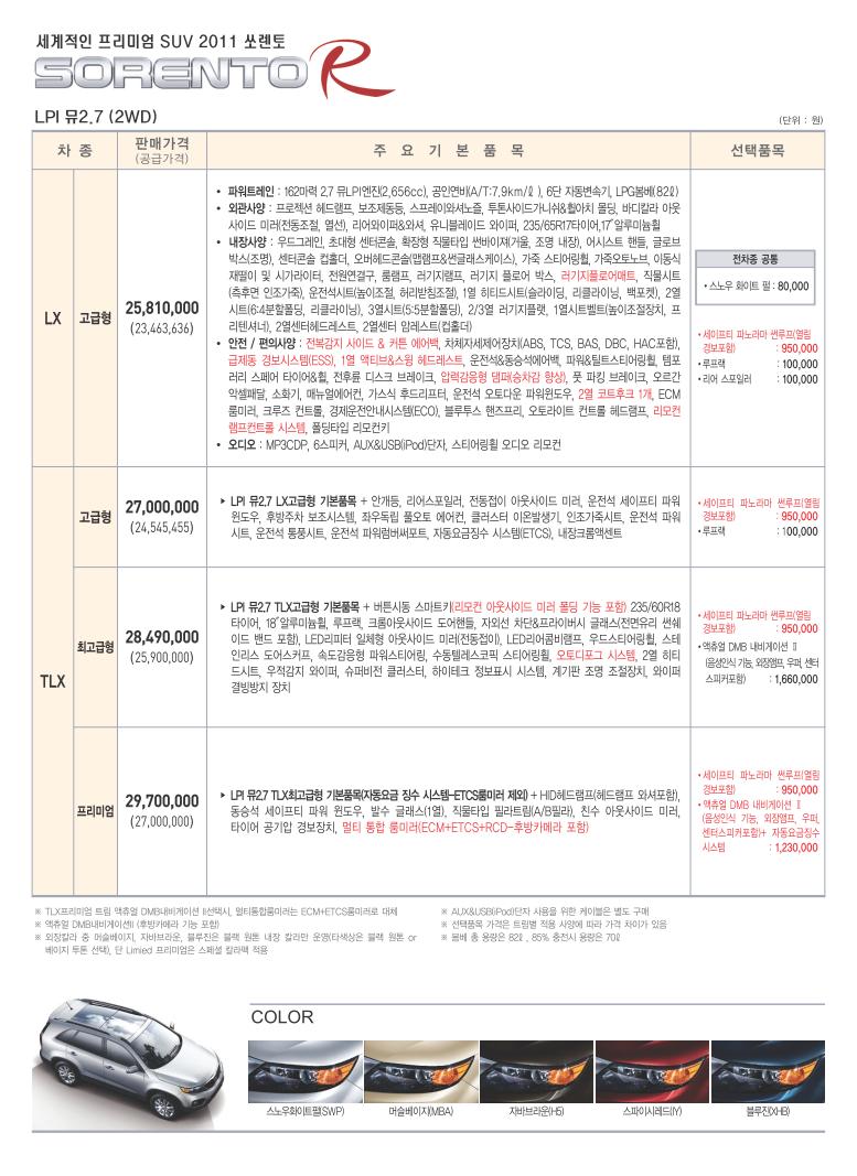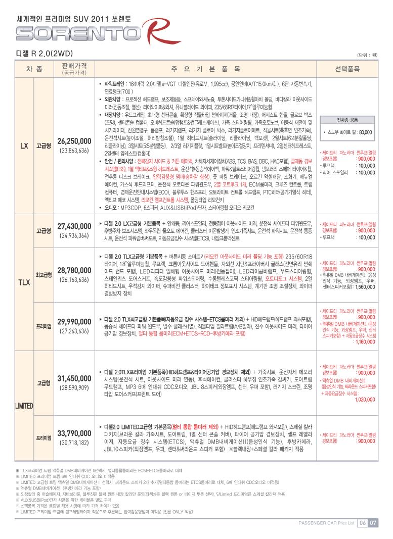 2010년 12월 쏘렌토R 신차가격표 (2011년형)