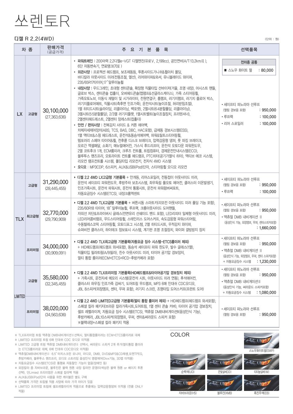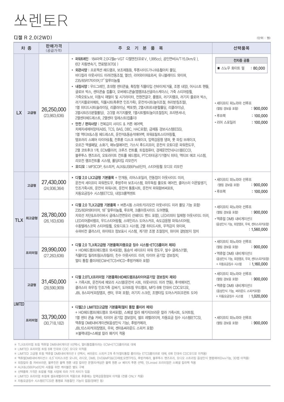 2010년 12월 쏘렌토R 신차가격표 (2011년형)