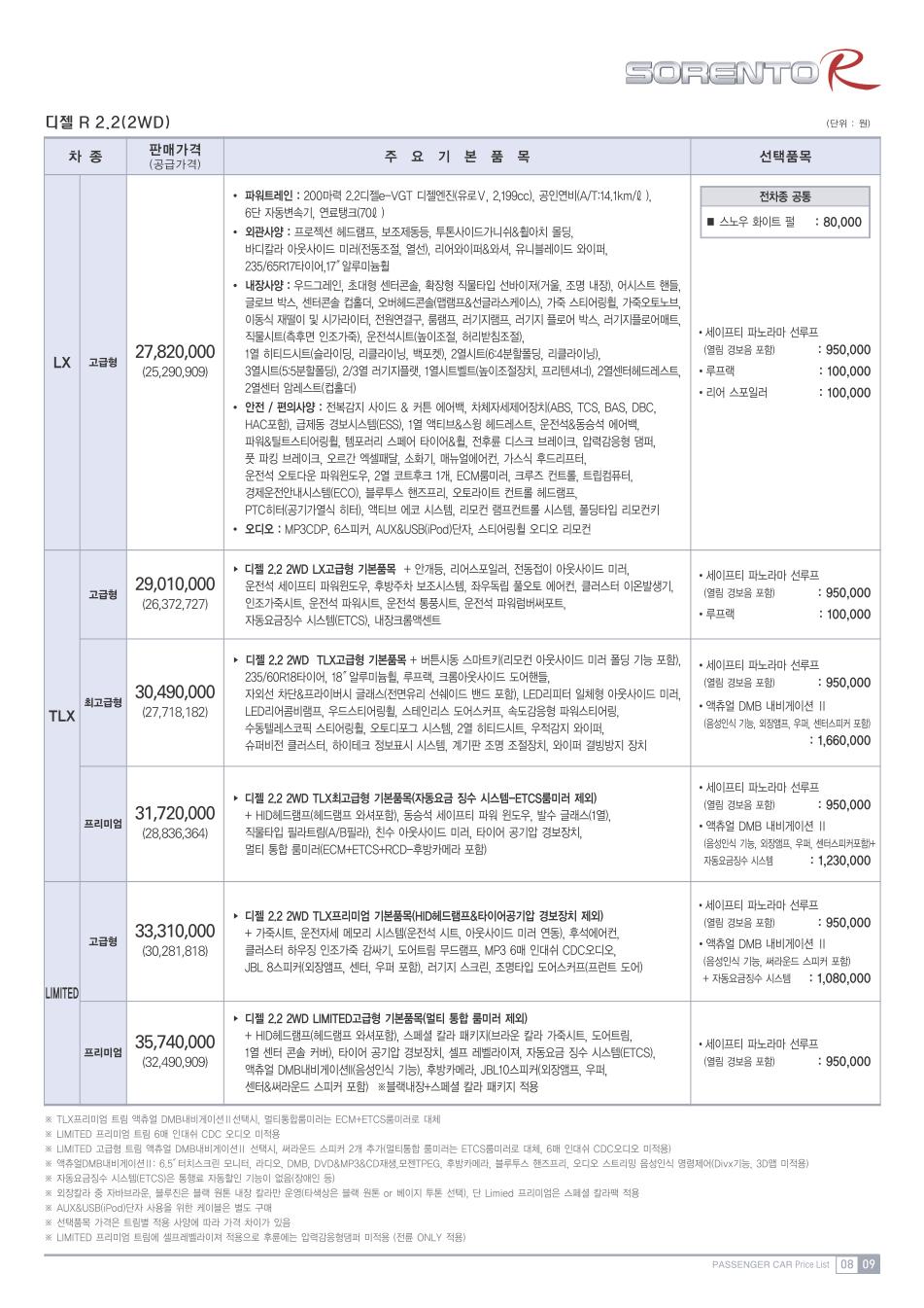 2011년 8월 쏘렌토R 신차가격표 (2012년형 출시)
