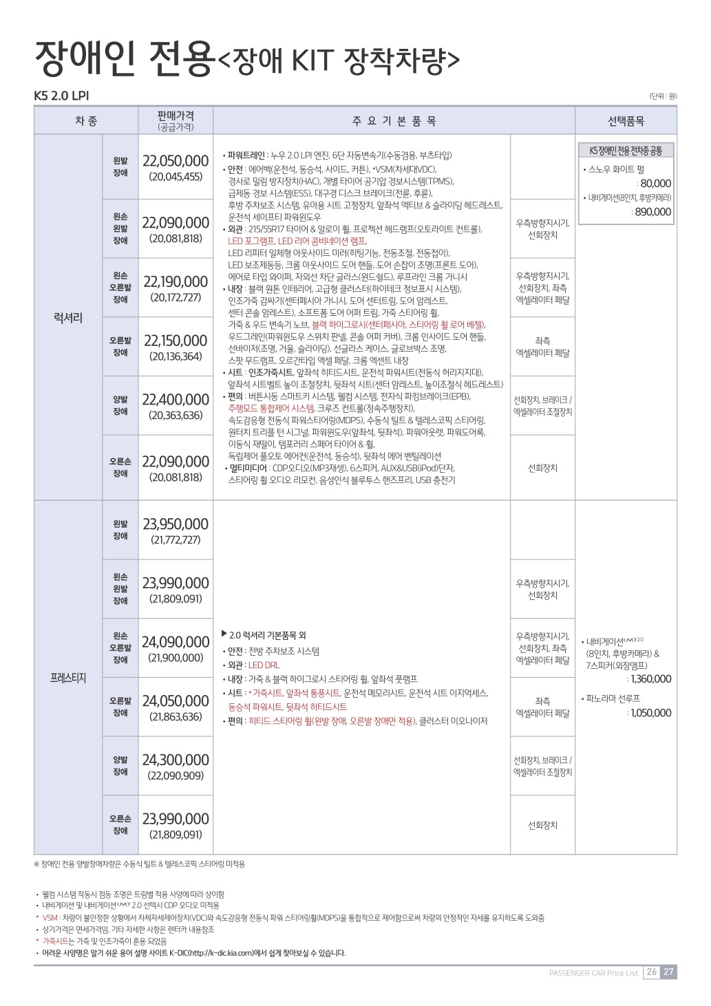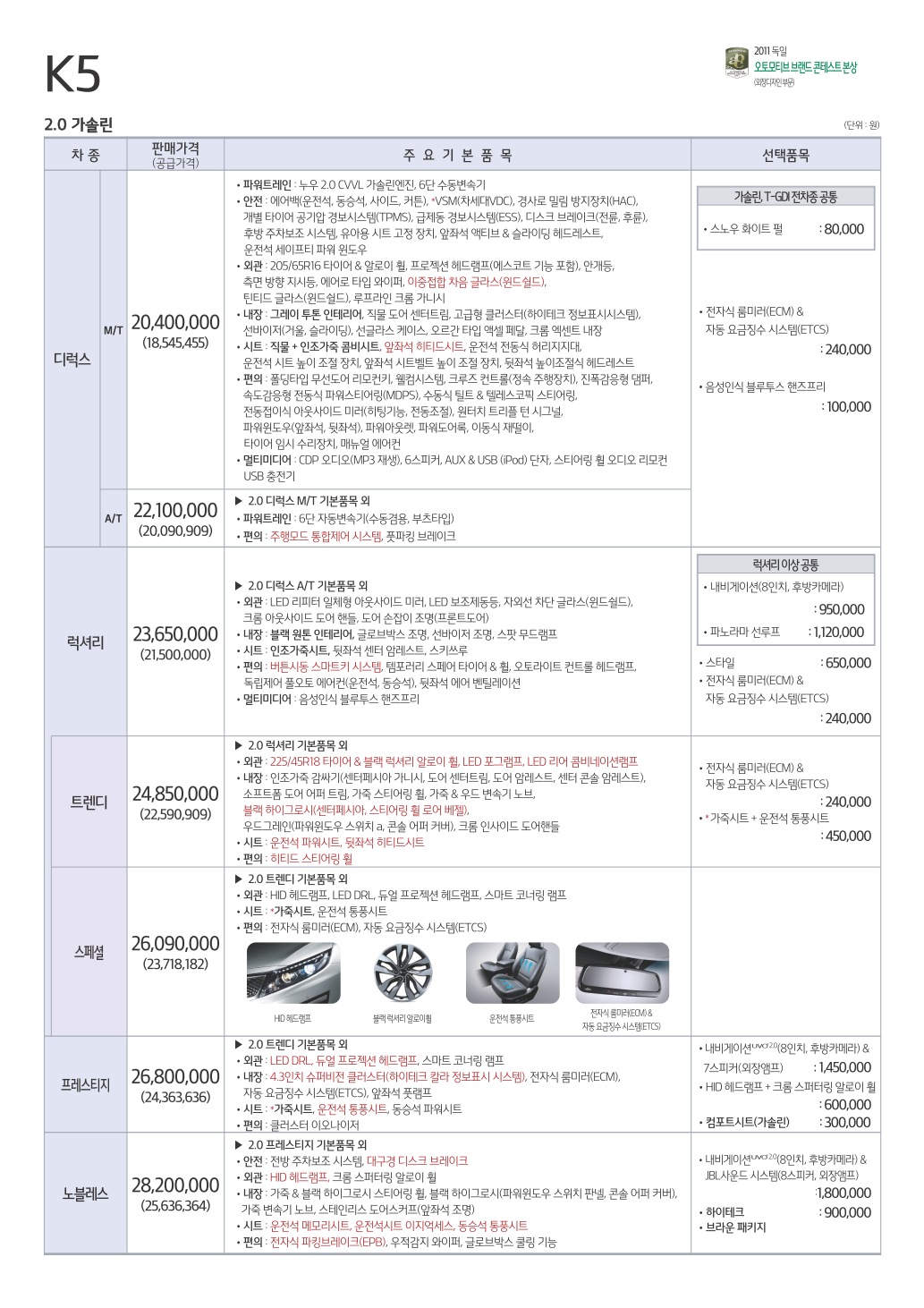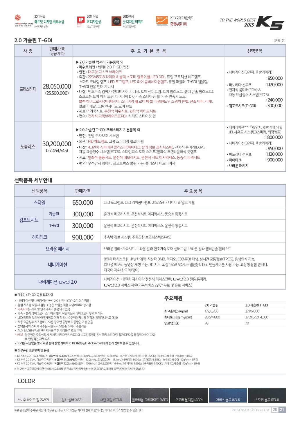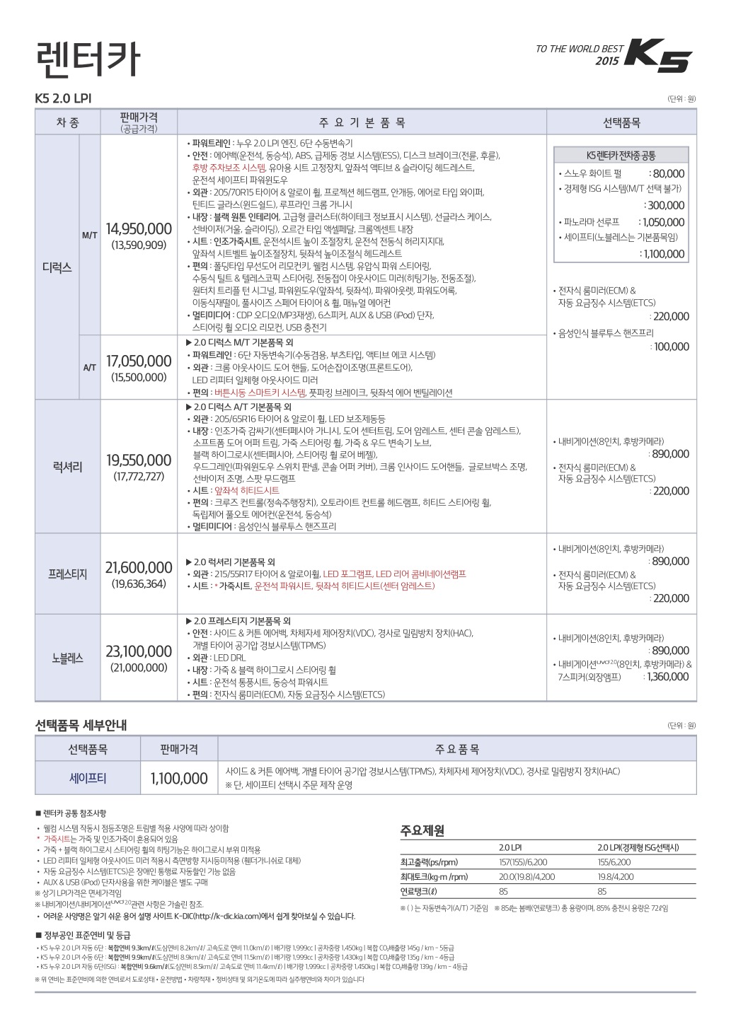 2015년 7월 K5 신차가격표 (2세대 K5 출시)