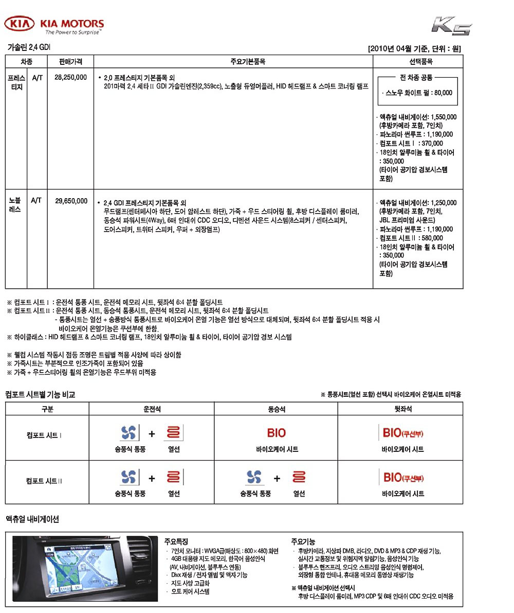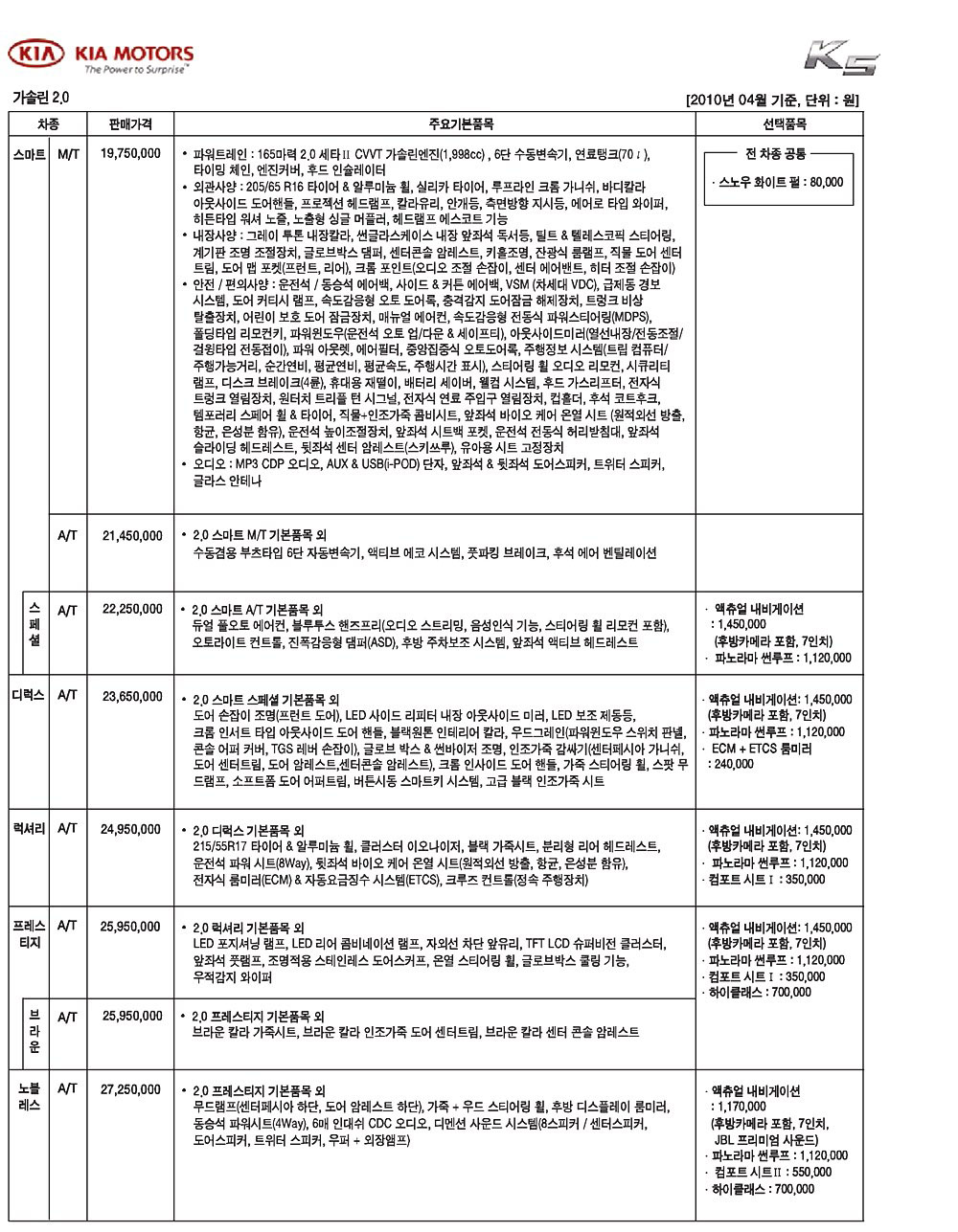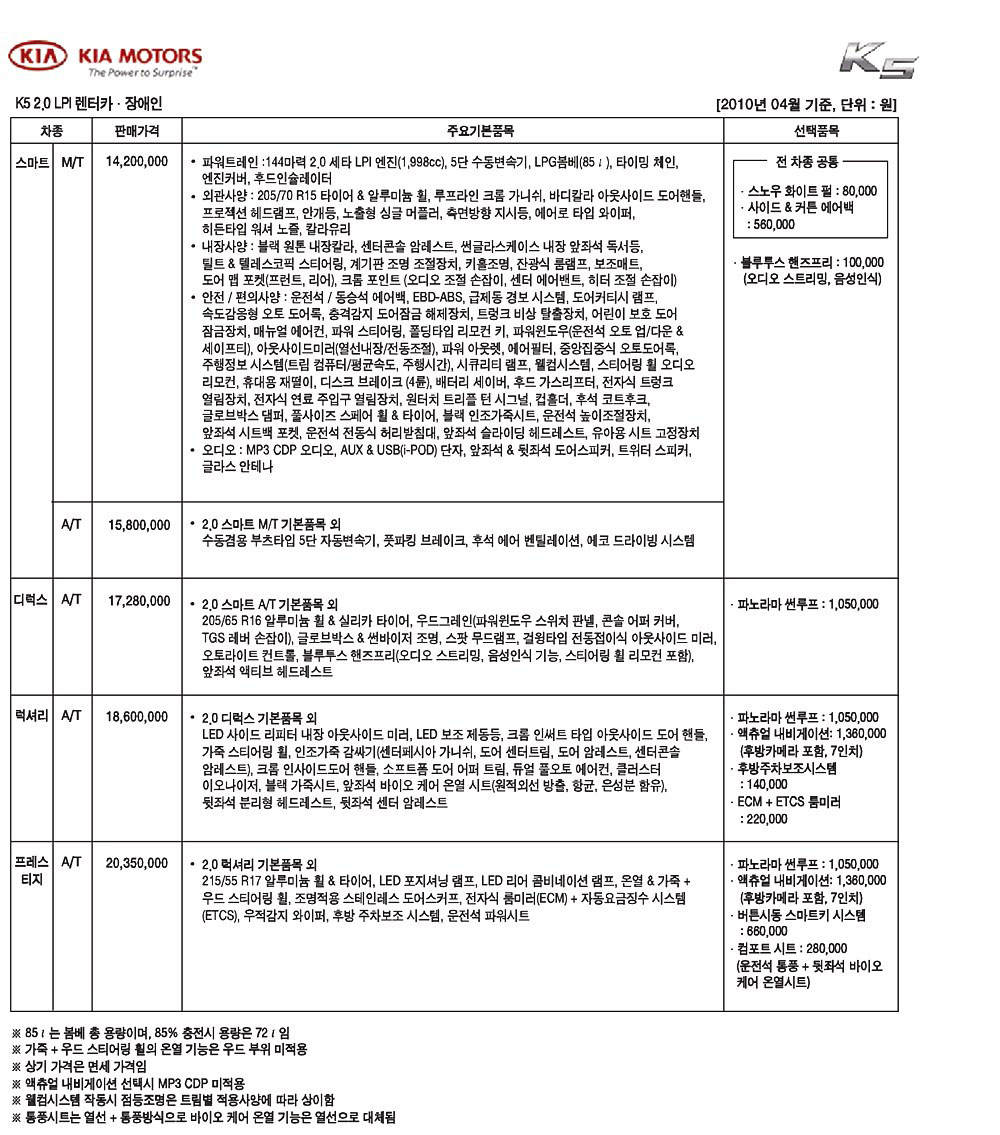 2010년 4월 K5 신차가격표