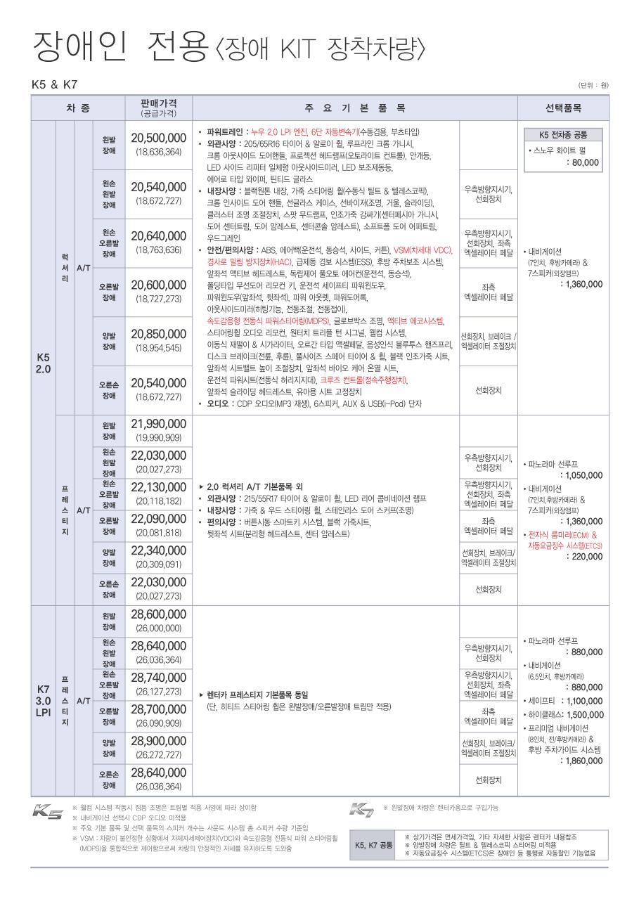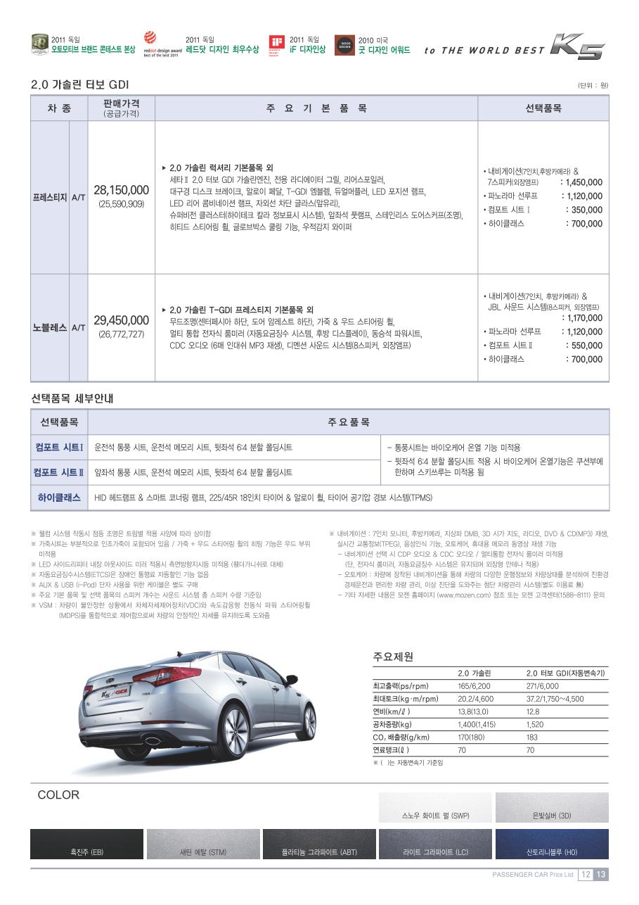 2011년 7월 K5 신차가격표 (K5 터보 출시 / LPi 누우엔진으로 변경)
