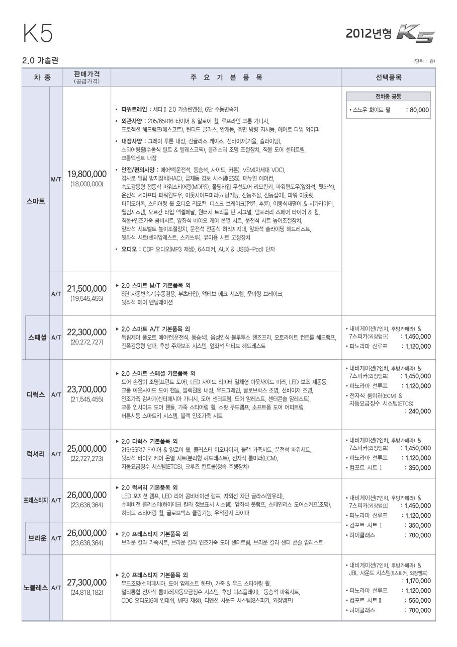 2012년 2월 K5 신차가격표 (가솔린 누우 CVVL 엔진 적용)
