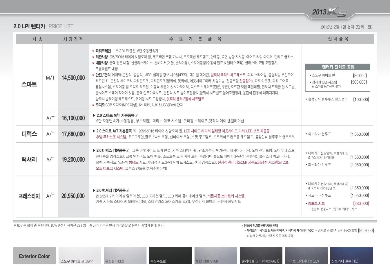 2012년 2월 K5 신차가격표 (가솔린 누우 CVVL 엔진 적용)