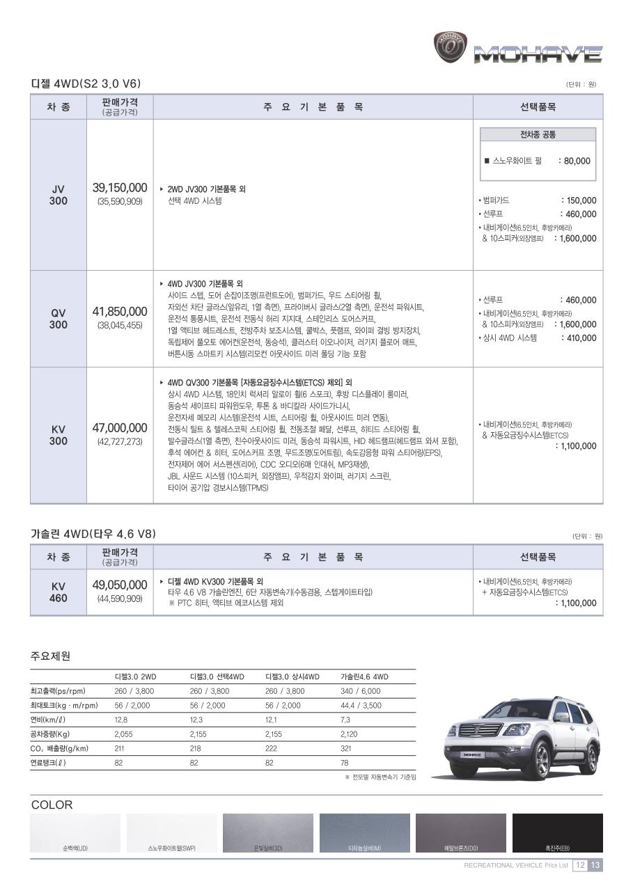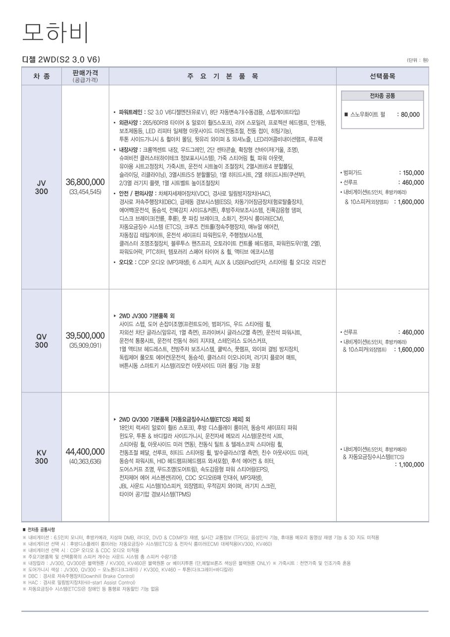 2011년 9월 모하비 신차가격표 (8단미션 적용)