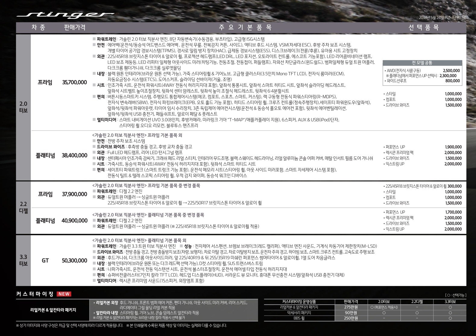 2018년 5월 스팅어 신차가격표 (2019년형)