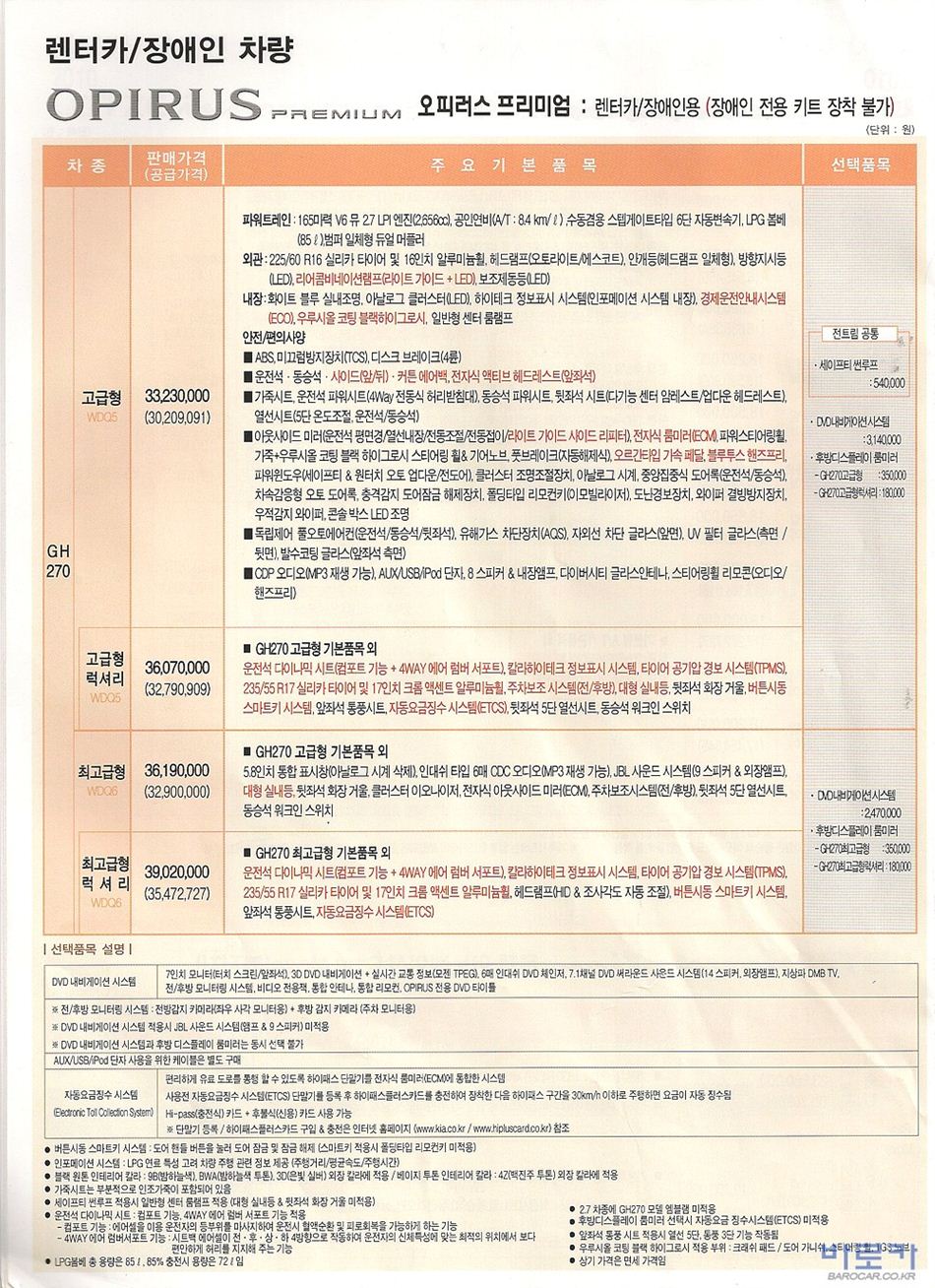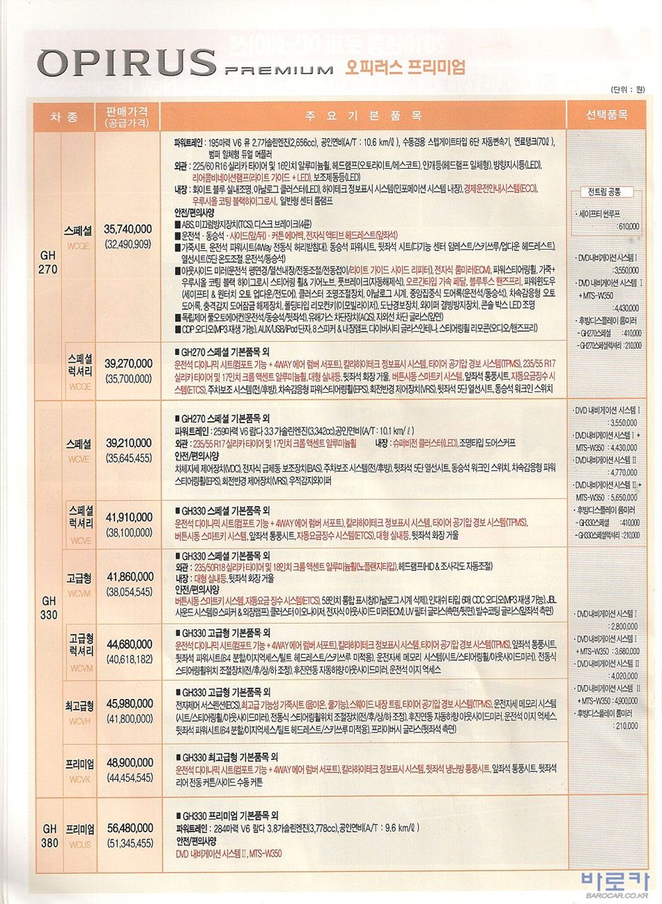 2010년 2월 오피러스 신차가격표