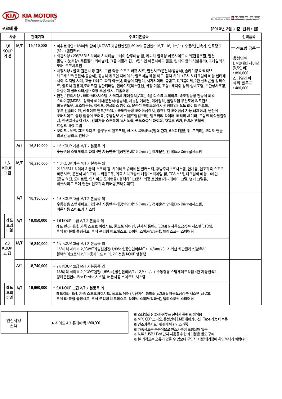 2010년 9월 포르테쿱 신차가격표 (GDi 출시)
