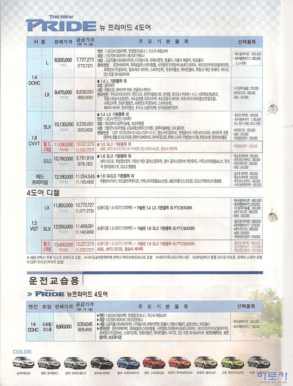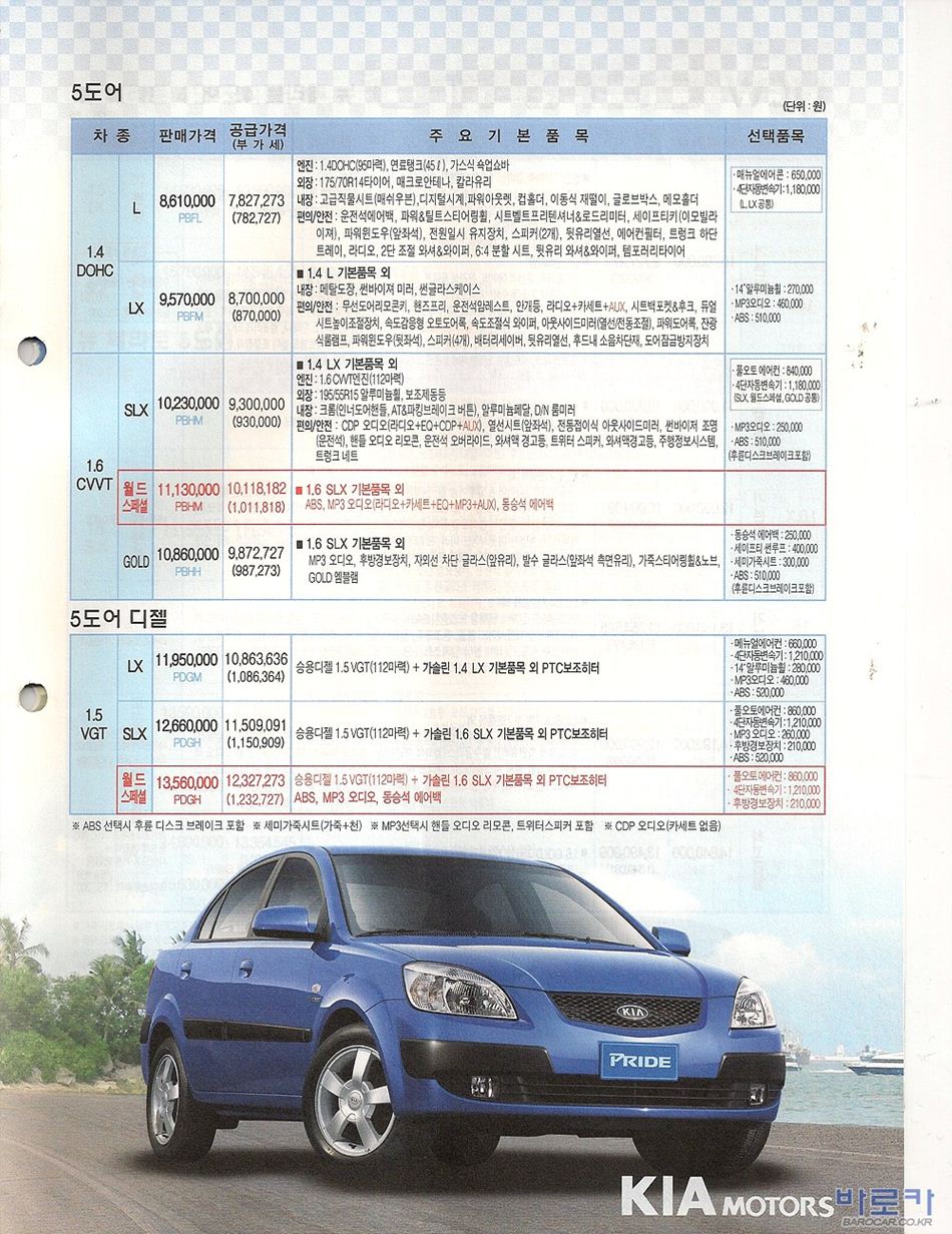2006년 1월 뉴프라이드(JB) 신차가격표