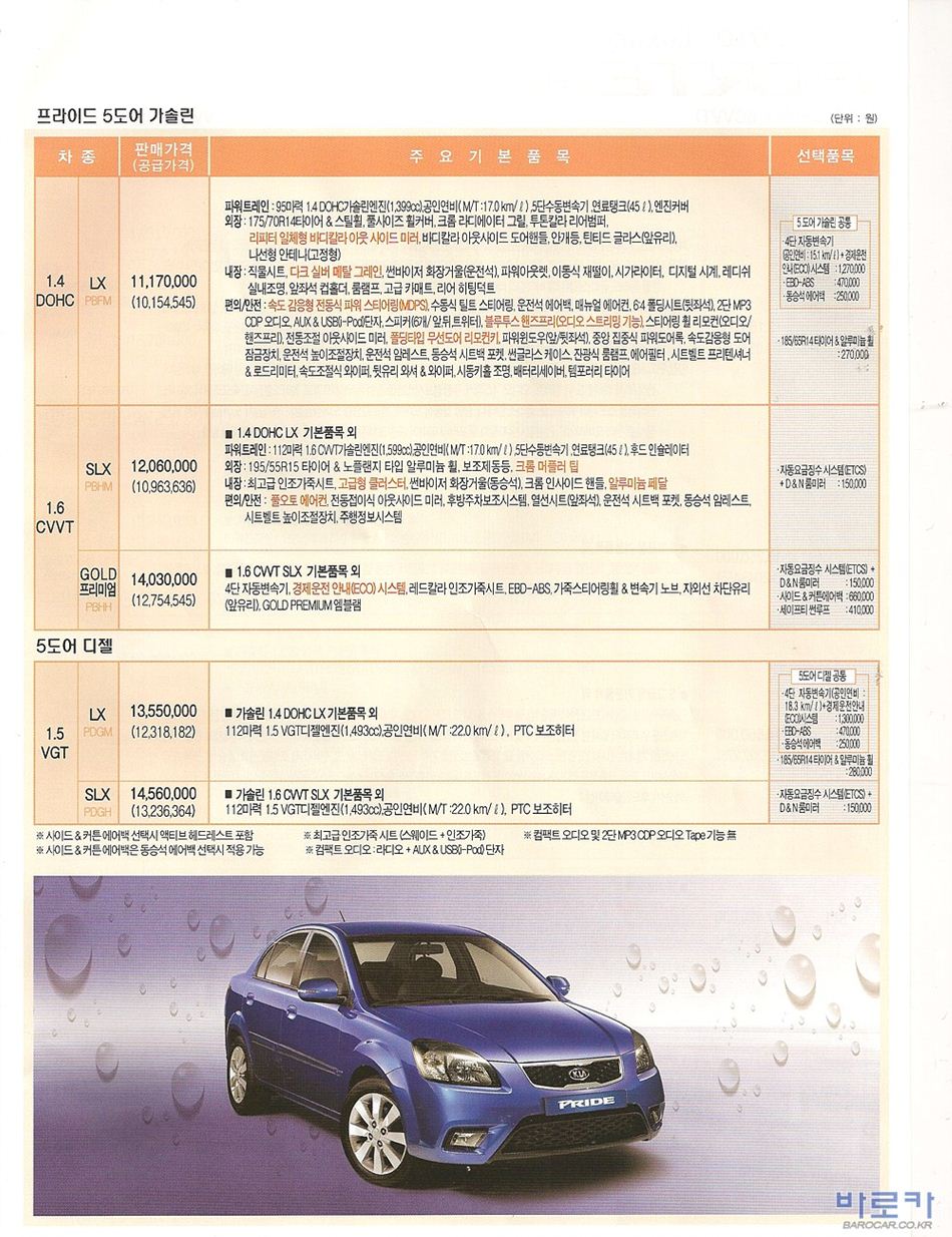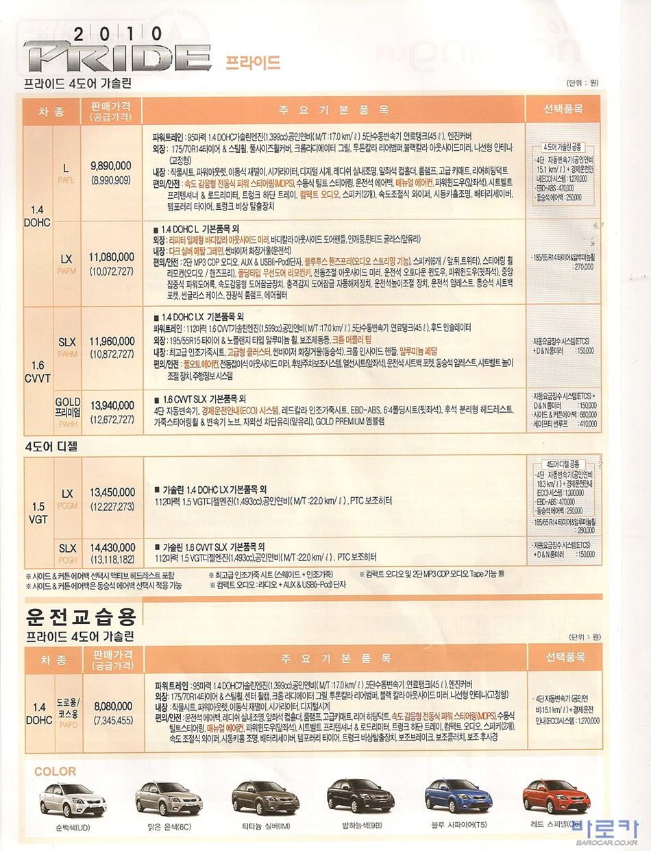 2010년 2월 뉴프라이드(JB) 신차가격표