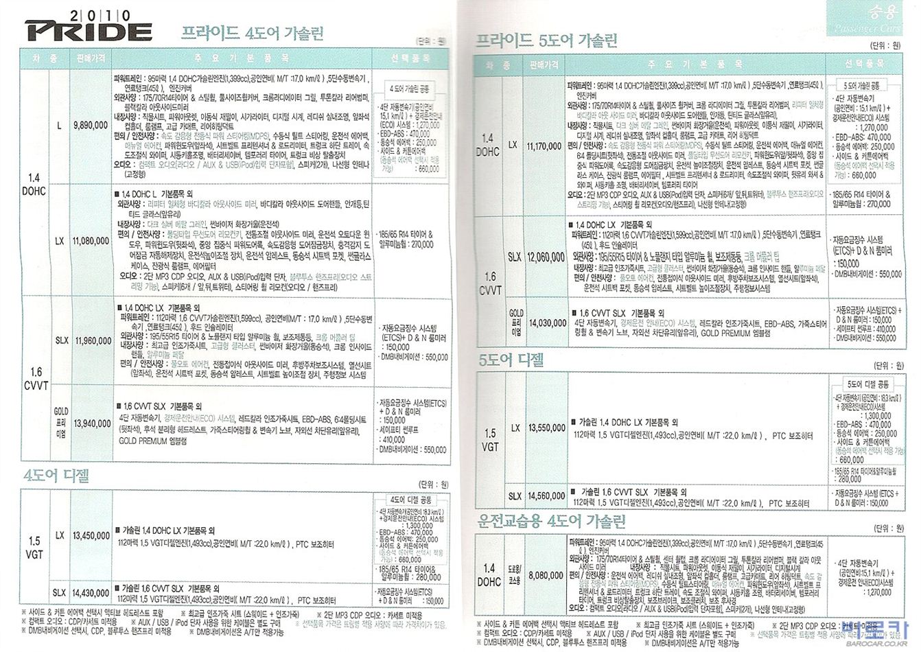 2010년 2월 뉴프라이드(JB) 신차가격표