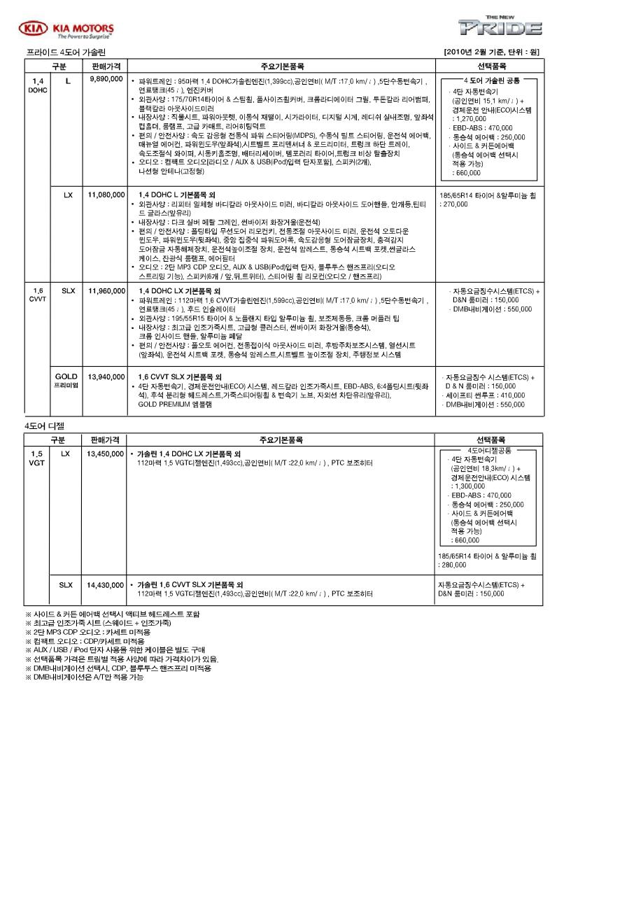 2010년 2월 뉴프라이드(JB) 신차가격표