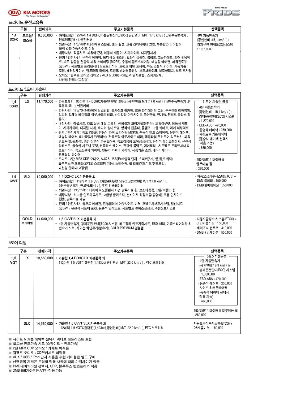 2010년 12월 뉴프라이드(JB) 신차가격표