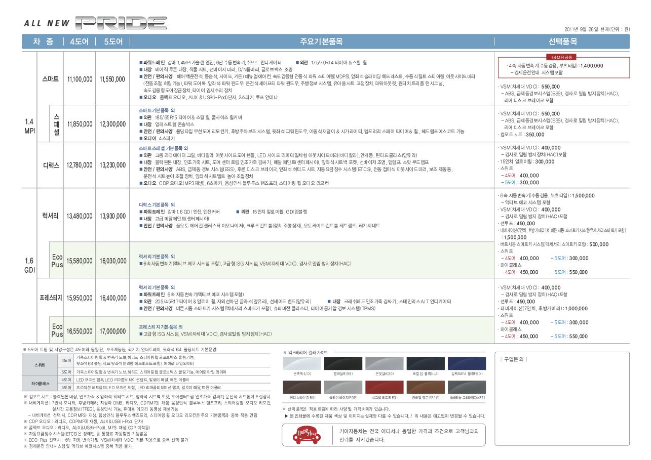 2011년 9월 올뉴프라이드(UB) 신차가격표